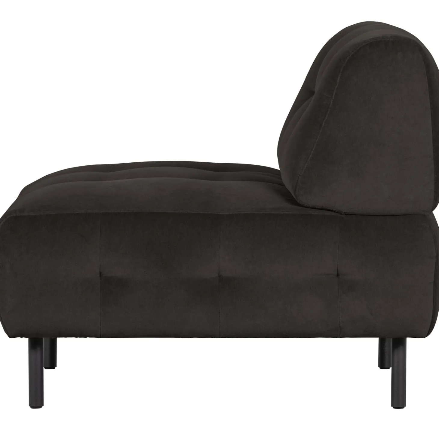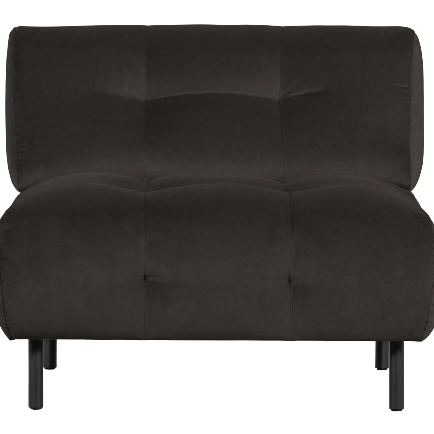 De gecapitonneerde rug en zitting geven de fauteuil een elegante uitstraling, terwijl het strakke silhouet zorgt voor een modern karakter. De licht matte glans van de velvet stof geeft de fauteuil een luxe en uitnodigende look. De slanke, zwartmetalen poten zorgen voor een luchtige en ruimtelijke uitstraling.