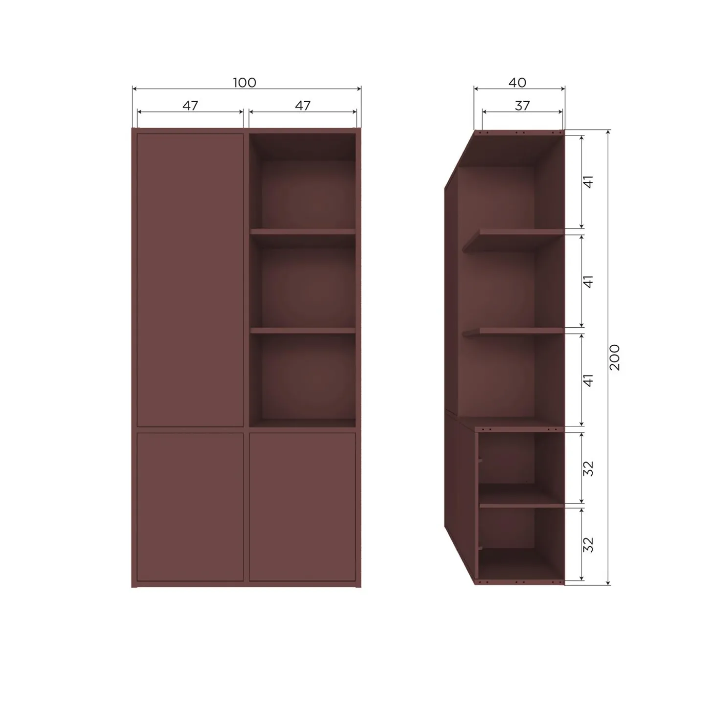 Met afmetingen van 200 cm hoog, 100 cm breed en 39,5 cm diep, past de Merel perfect in de hoek van je woonkamer, slaapkamer of werkkamer. De vakken aan de bovenkant (41 cm hoog) zijn ideaal voor grotere items, terwijl de vakken aan de onderkant (31,6 cm hoog) perfect zijn voor boeken of decoratie. Elke plank draagt tot 10 kg gelijkmatig verdeeld gewicht.