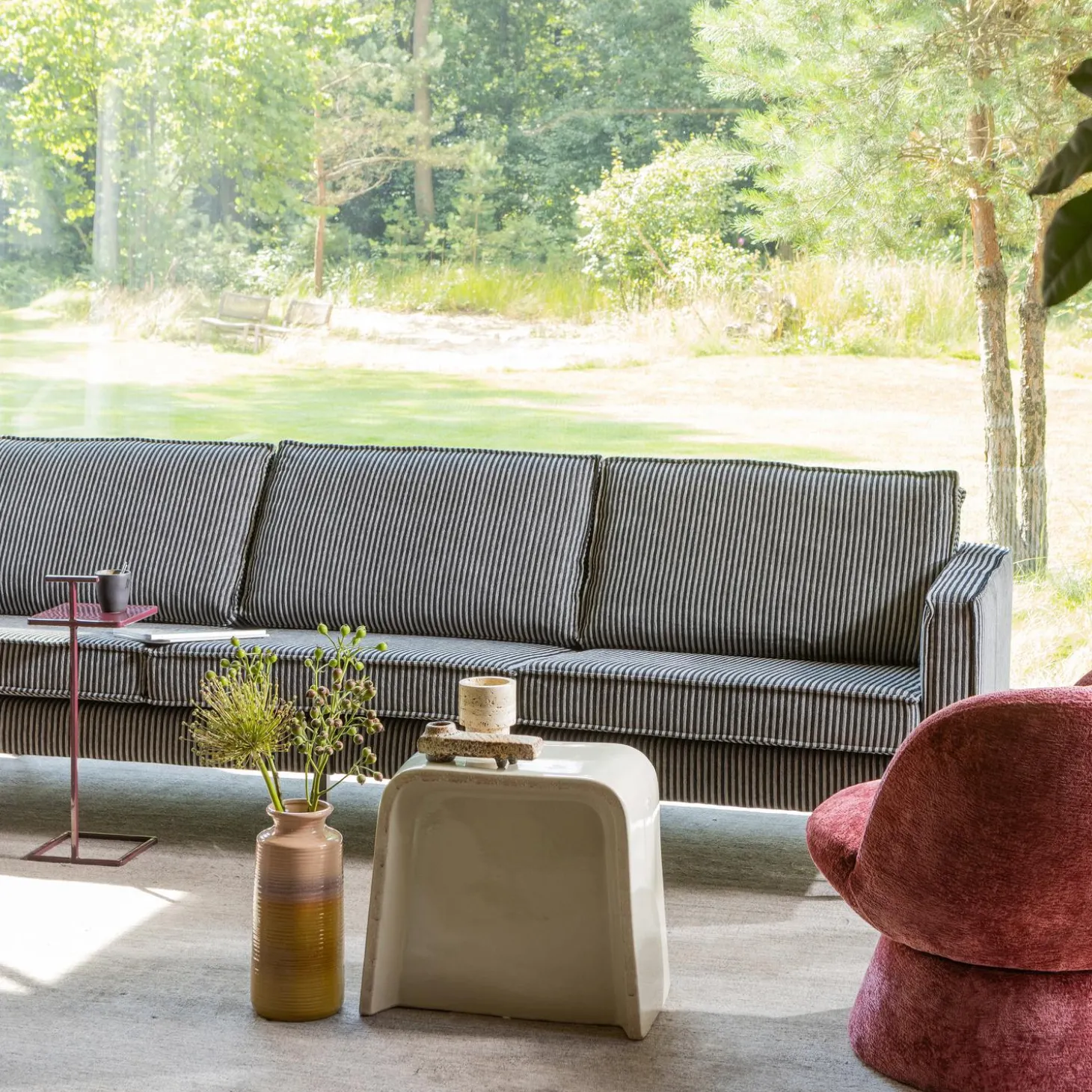 De geweven stof heeft een prachtig streeppatroon en een verfijnde textuur die direct een warme sfeer aan elke ruimte toevoegt. Met een Martindale van 30.000 is deze stof geschikt voor normaal gebruik. De combinatiestof bestaat uit 48% polyester, 31% rayon en 21% katoen, de gebruikte weeftechniek geeft de stof een volle en rijke uitstraling. De combinatie van deze stof met de zwart metalen slanke poten maakt Vogue eigentijds en uniek.