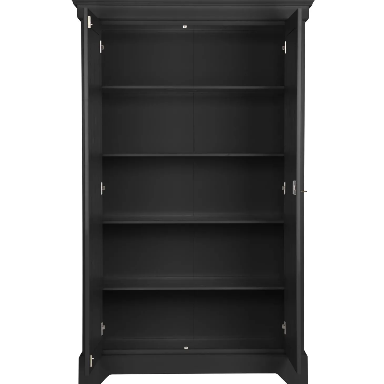 Wat een plaatje! Deze brocante, tijdloze wandkast Isabel uit de WOOOD collectie. Deze kast brengt direct sfeer in je interieur. Hij past prima in meerdere woonstijlen en leent zich perfect voor in een woonkamer of slaapkamer. De kast is gemaakt van zwart, gelakt grenenhout dat afkomstig is van een FSC gecertificeerde leverancier. Het interieur van deze kast is gemaakt van gemêlamineerd spaanplaat en bevat 4 legplanken. De deuren van de kast zijn voorzien van een slot met sleutel.