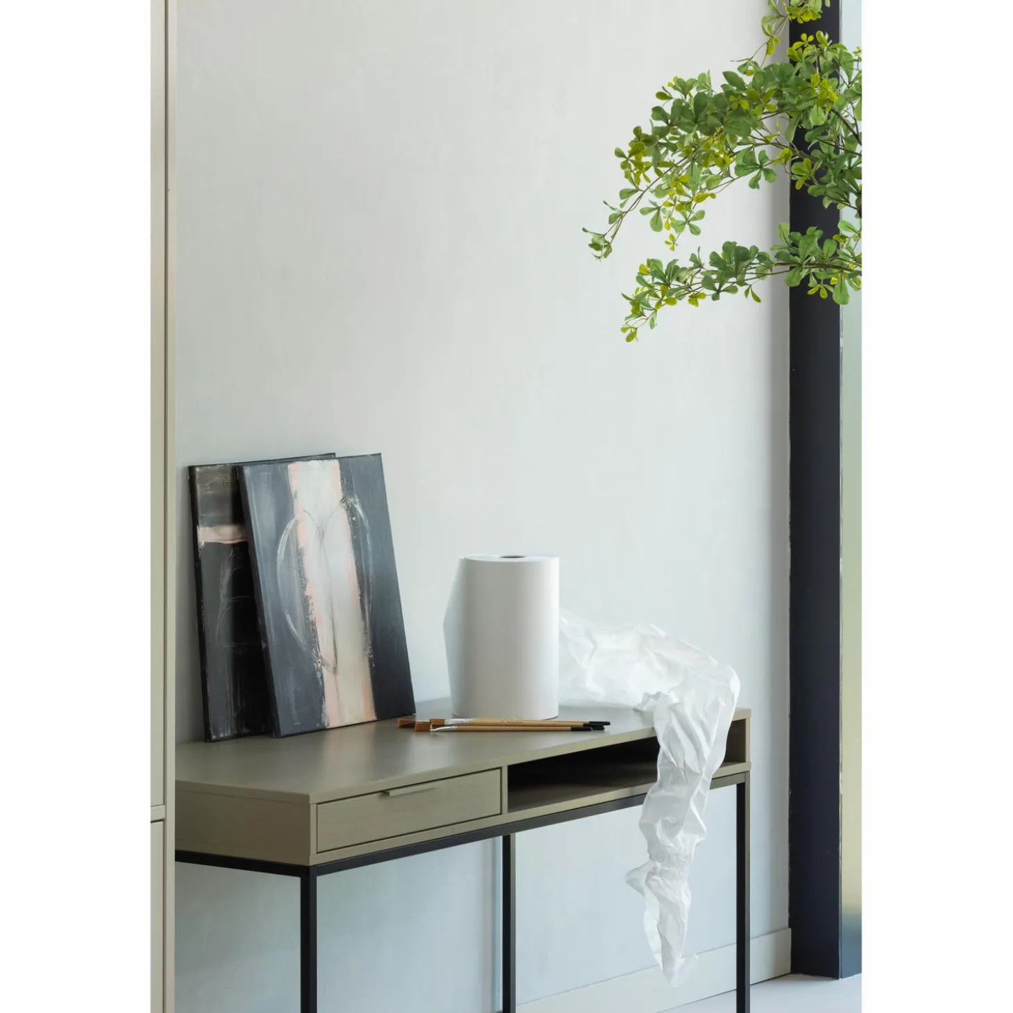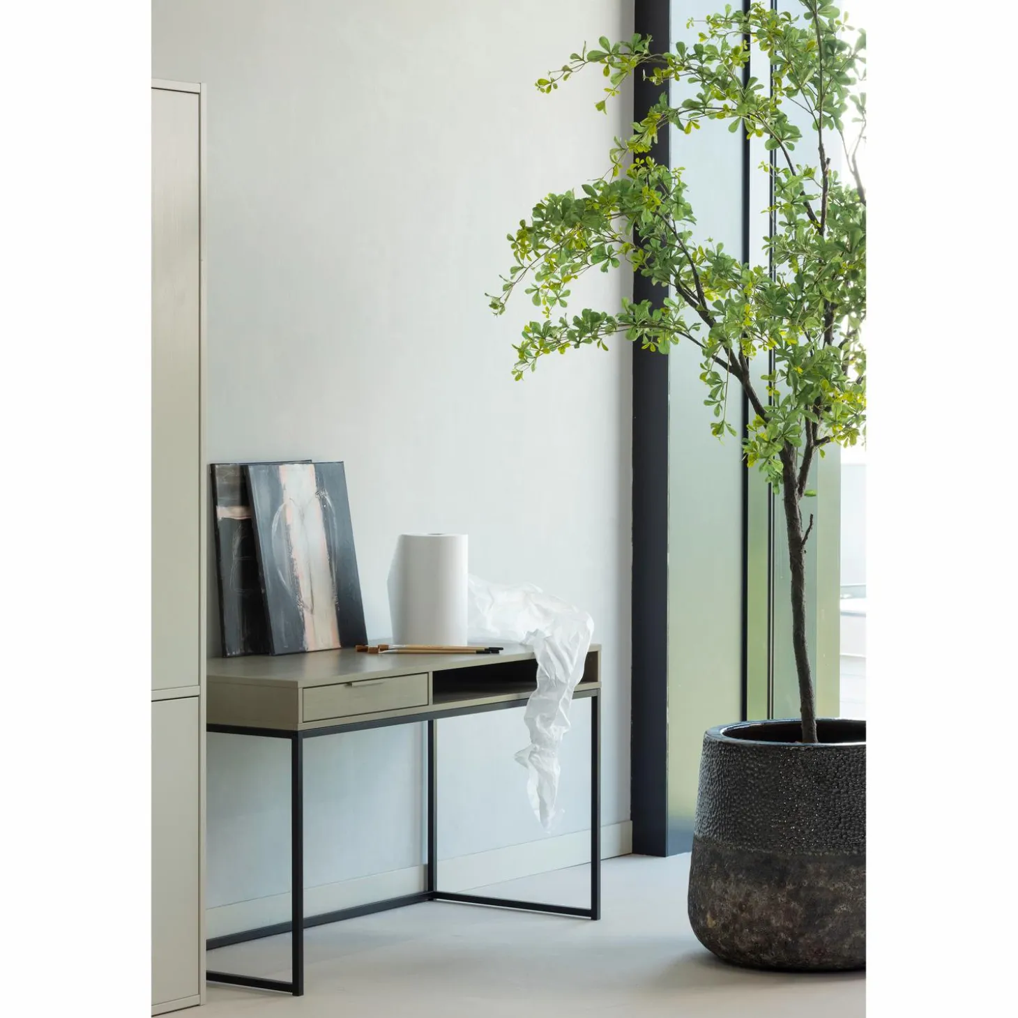 Grenenhout in mud‑tint met zwart metalen onderstel, past bij elke interieurstijl
