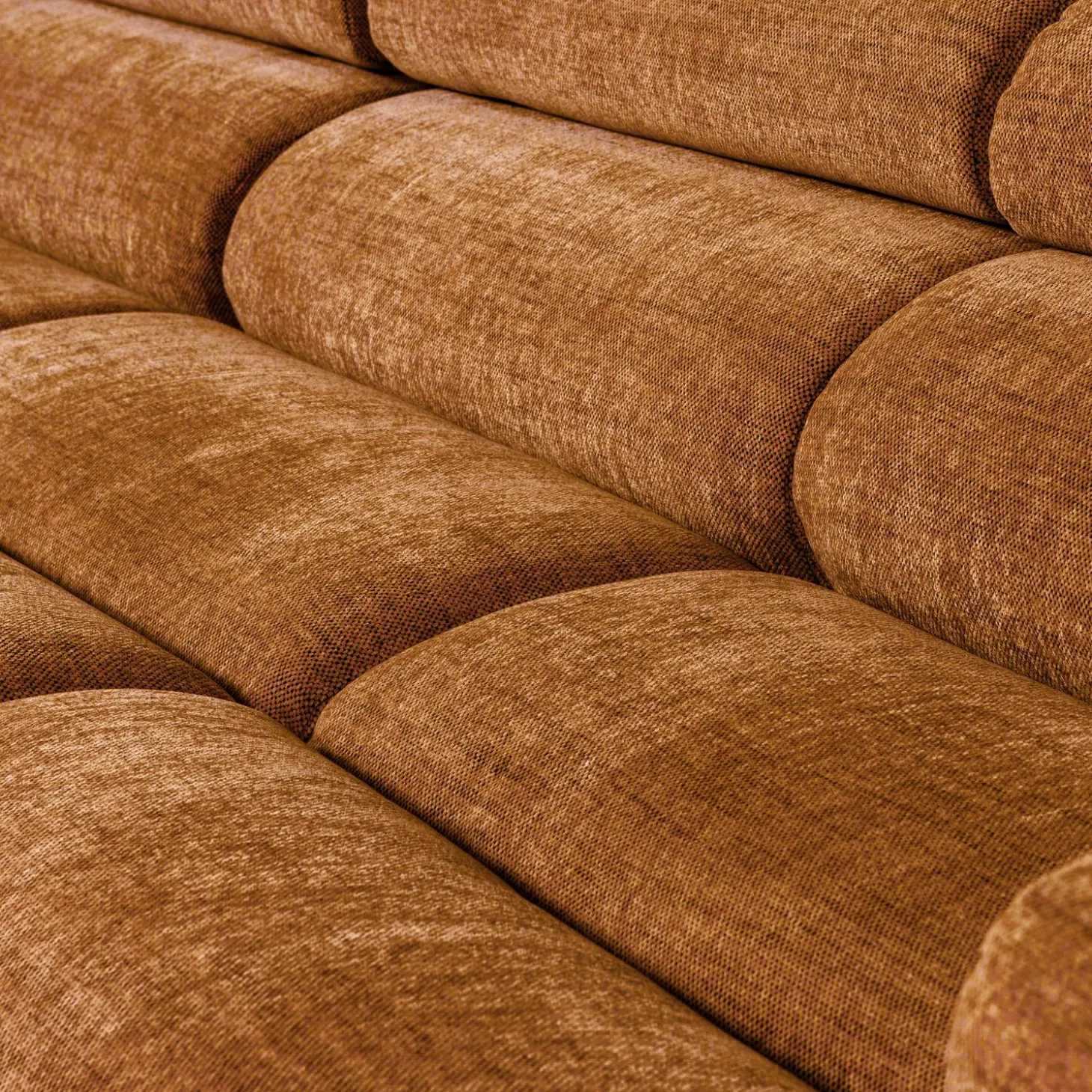 De oranje melange-stof zorgt voor die extra textuur die je interieur net dat beetje meer karakter geeft. En die vriendelijke, afgeronde vormen? Die maken dat je gasten zich meteen thuis voelen. Het is alsof de bank je uitnodigt om te blijven, te ontspannen, te genieten.