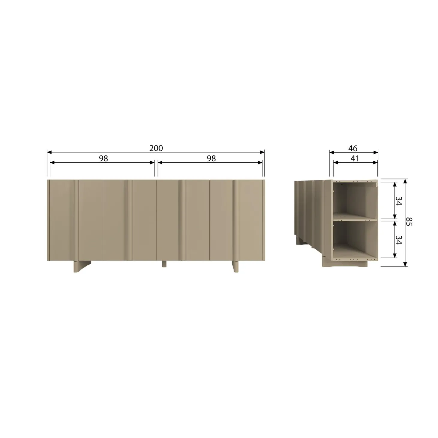 Basu heeft een hoogte van 85cm, een breedte van 200cm en een diepte van 46cm.Afmeting van de 4 kastdeuren: H 75 cm x B 50 cm en van de 8 vakkenH 33 cm x B 48 cm. Het draaggewicht van de bovenzijde is 35 kg en het draaggewicht per plank is 15 kg. Basu staat op een pootje met een hooget van 10cm.