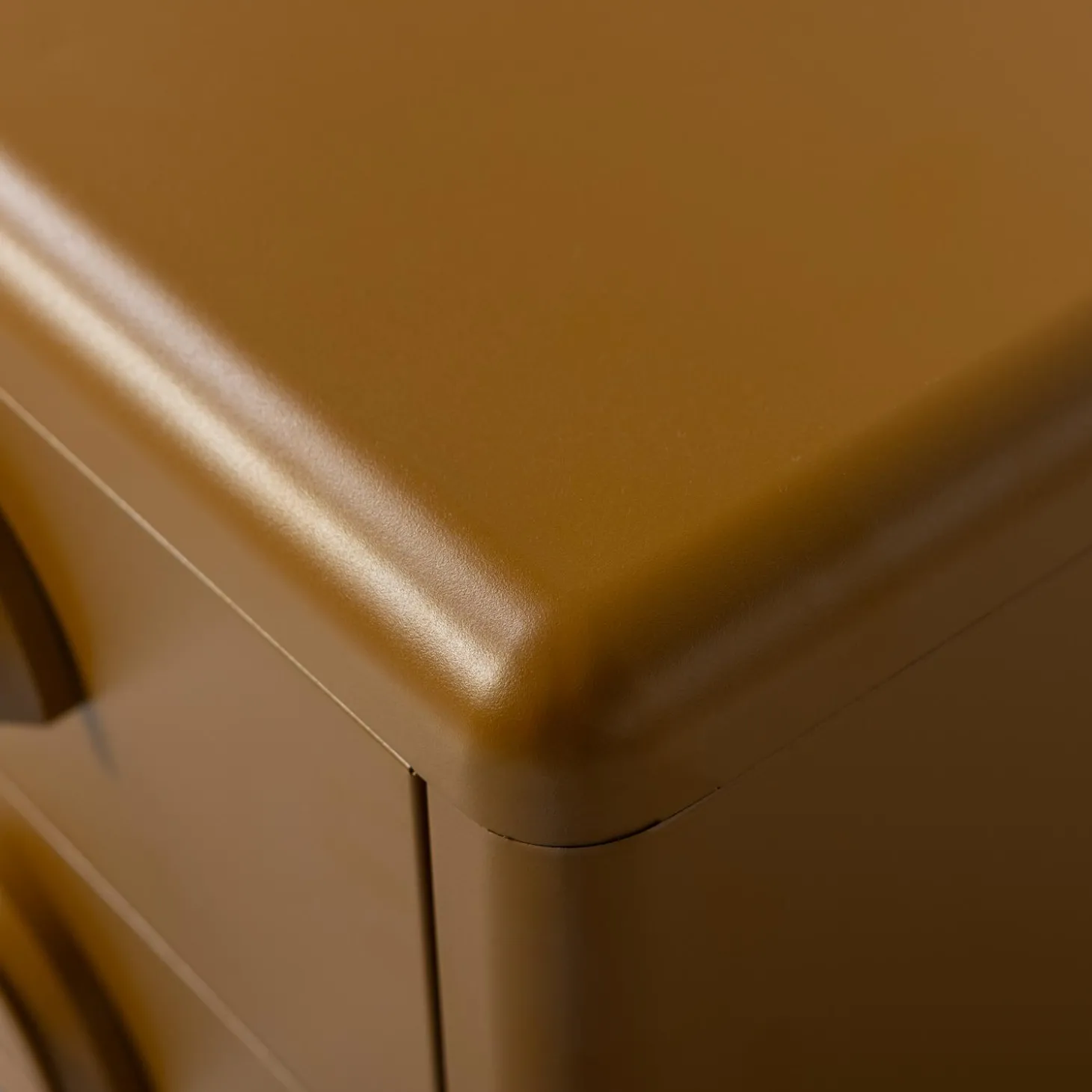 De afgeronde hoeken zijn gevormd uit geknipt en zorgvuldig gebogen metaal,een verfijnde techniek waarbij de naden soms licht zichtbaar blijven. Dit draagt bij aan het unieke karakter van Rune. Het kastje is afgewerkt met een hoogwaardige poedercoating die niet alleen zorgt voor een luxe matte of subtiel glanzende uitstraling, maar het metaal ook beschermt voor de lange termijn. Alle metalen uit deze collectie zijn grondig behandeld en vragen dus niet om een herbehandeling. Behandeld metaal is eenvoudig schoon te houden met een lichtvochtige doek, het nadrogen van het oppervlak zorgt voor een streeploos resultaat.