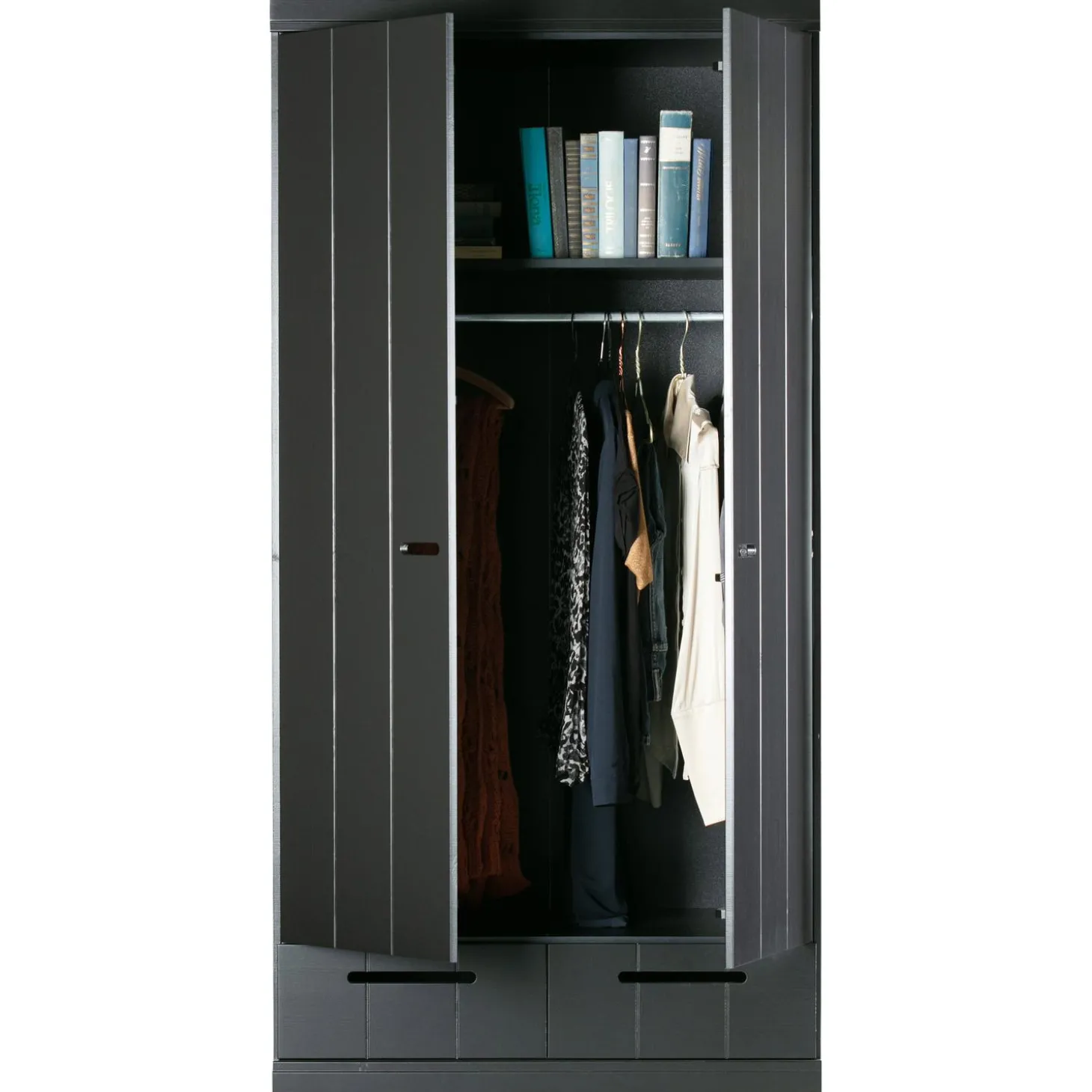 Nu ook in de kleur zwart. Uit de serie CONNECT; een stoere basic 2-deurs kledingkast met strakke sokkel en koof gecombineerd strokendeuren met sleufgrepen en2 lades voorzien van solidemetalen ladegeleiders.