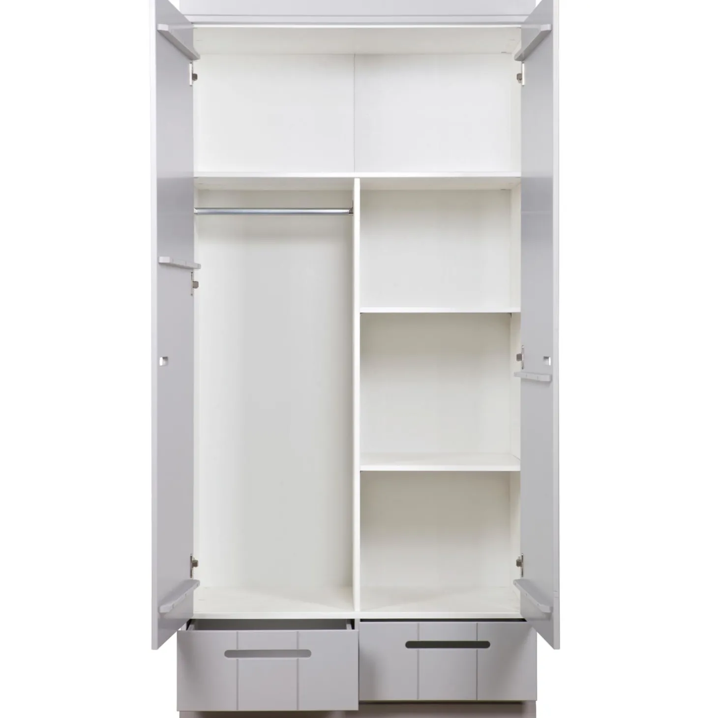 Dit interieurpakket is toepasbaar op de kledingkasten van de serie CONNECT. Perfect voor als jij liever je kleding of spullen wilt neerleggen in plaats van ophangen. Want met deze plankenset creëer je in het midden van de kast een tussenschot met aan de ene zijde een korte roede en aan de andere kant 3 gedeelde legplanken. De kasten Connect hebben standaard een hang-/leg interieur (1 roede + 1 legplank), dus met dit interieurpakket geef je de kast dus extra ruimte om spullen neer te leggen ipv op te hangen.