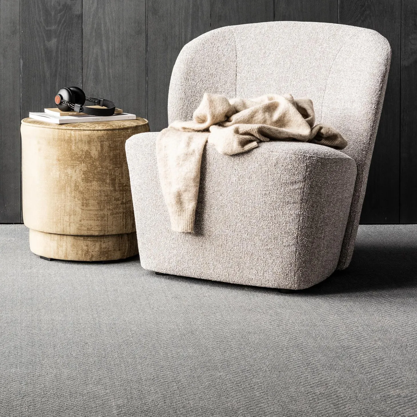 Deze fauteuil is uitgevoerd in een gemêleerde stof, Lofty is verkrijgbaar in meerdere stoffen, bekijk ook de Lofty fauteuil in de Bouclé stof.