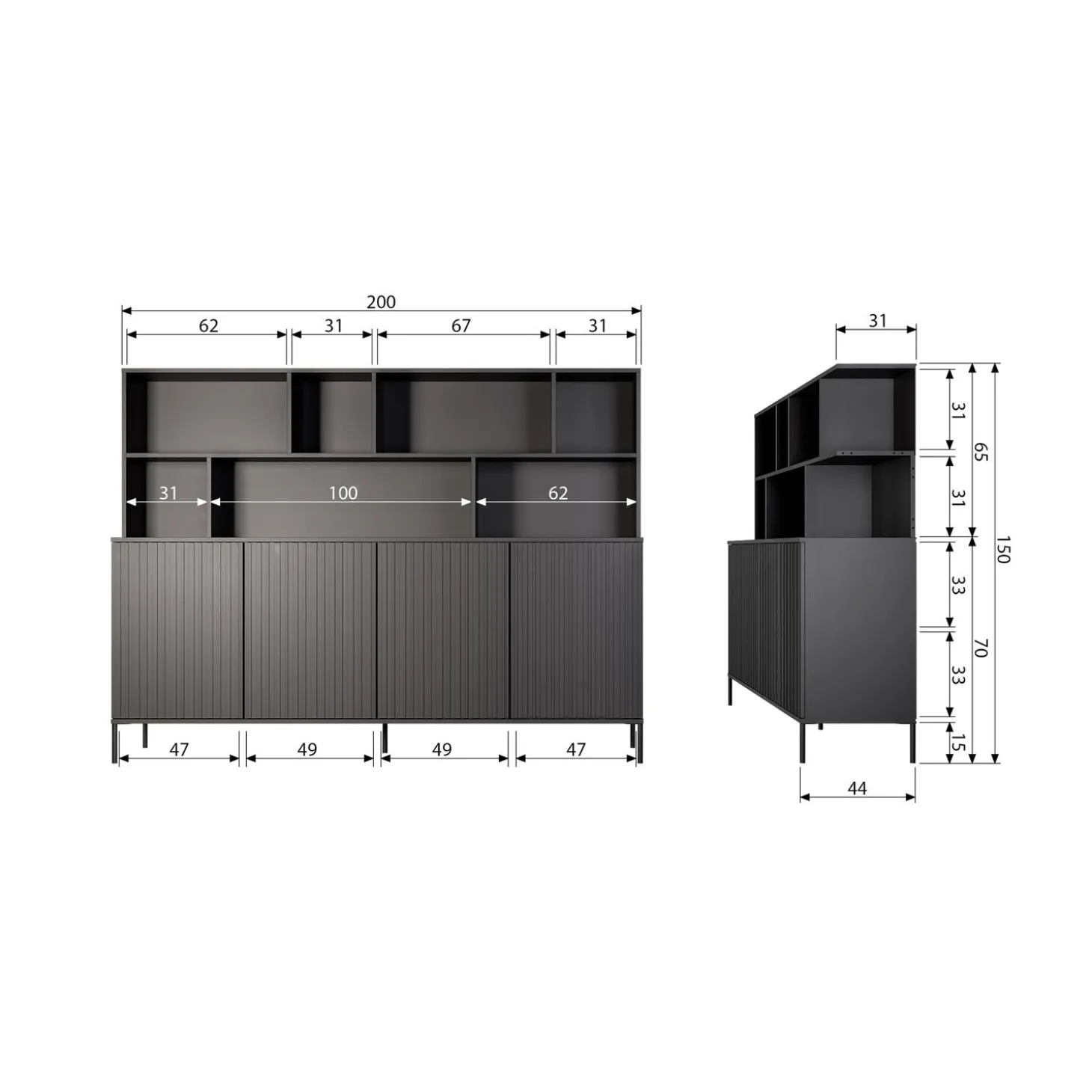 De New Gravure wandkast heeft een hoogte van 150 cm. De breedte is 200 cm en 44 cm diep. De opzetkast heeft een diepte van 30 cm. De bovenste vakkenrij heeft een hoogte van 31 cm en verschillende breedtes van +/- 60 cm en +/- 31 cm. De onderste vakkenrij heeft drie vakken met een hoogte van eveneens 31 cm en breedtes van 31/100/62 cm. De diepte van de vakken is 28 cm, de tussenpanelen zijn 2,5 cm dik. De vier deuren zijn elk 66 cm hoog, 50 cm breed en 2 cm dik. De dichte kast beschikt over vier uitneembare legplanken die tevens in hoogte verstelbaar zijn. Door de legplanken worden er acht vakken van 32,5×47,5×41 cm (hoogte x breedte x diepte) gecreëerd, genoeg opbergmogelijkheden dus. De metalen poten zijn 15 cm hoog en hebben een diameter(ø) van 2cm.
