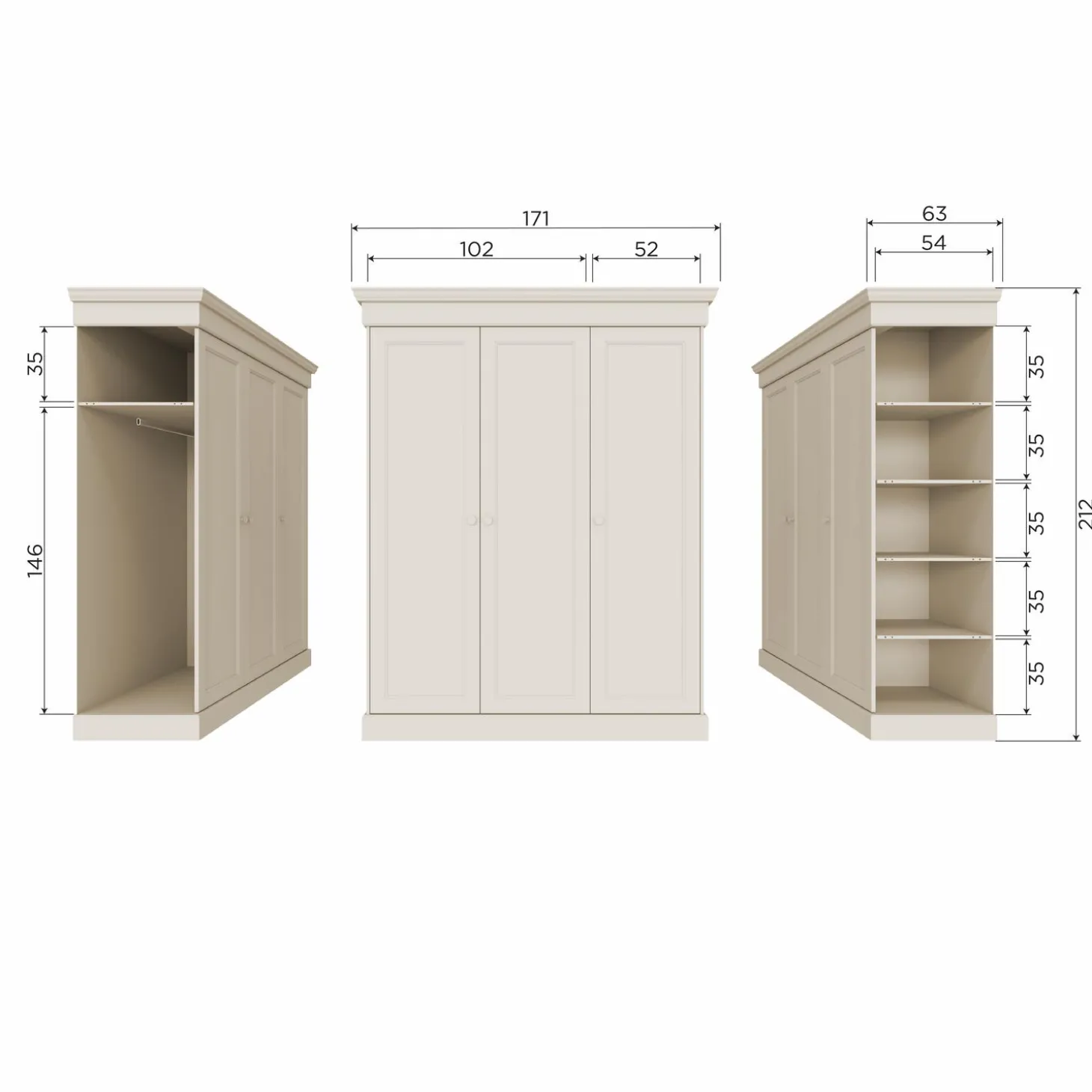 – Breedte dubbele kastdeuren: 102 cm