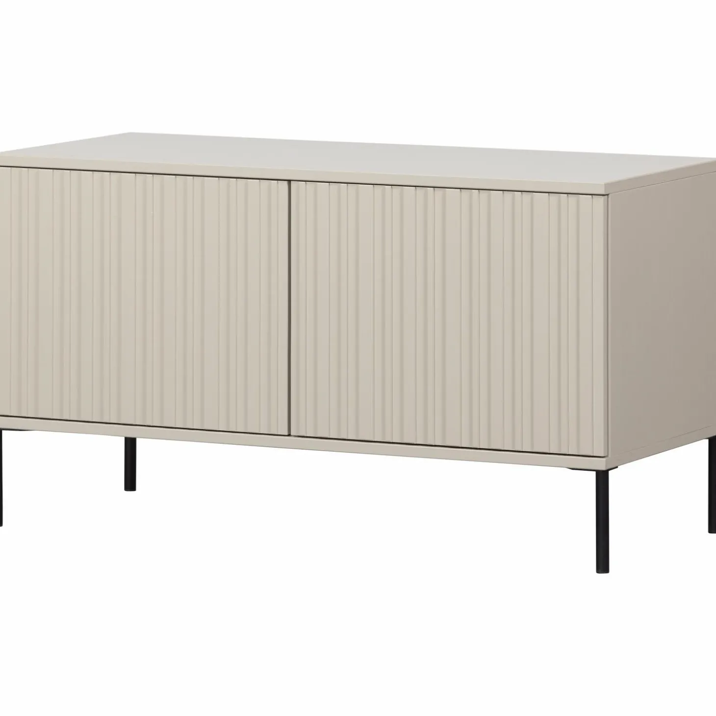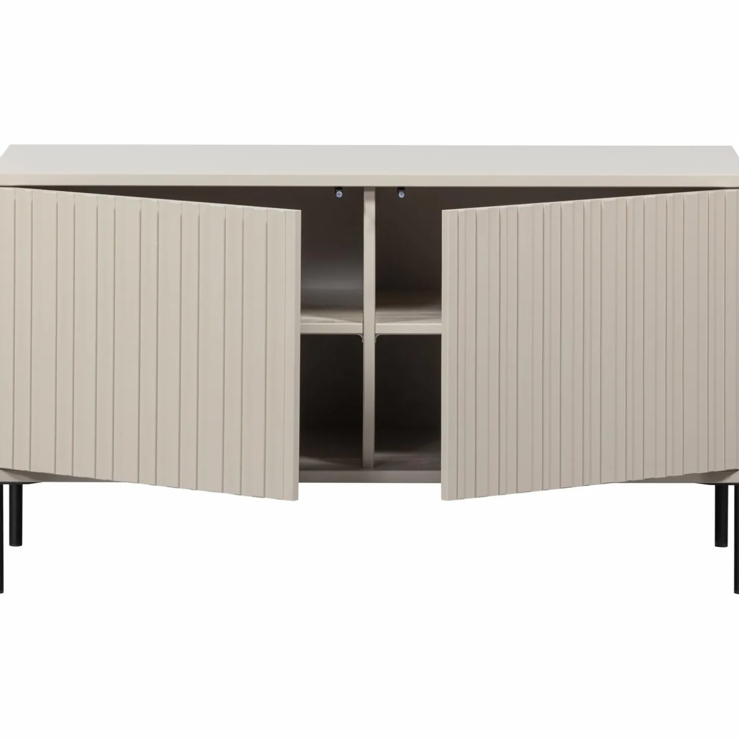 Het interieur bestaat uit spaanplaat in de kleur zwart, wat een mooi contrast biedt. De poten zijn van metaal en voorzien van een zwarte coating. Dit geeft de kast een strakke moderne uitstraling. Door het specifieke lijnenspel op de deuren heeft dit tv meubel echt een eigen karakter. Achter elke deur vind je twee ruime opbergvakken, perfect voor het opbergen van je spullen. En dankzij het geluidloze push-to-open systeem kun je de deuren eenvoudig openen, wat zorgt voor een strakke en moderne afwerking. Dit New Gravure tv meubel combineert stijl en praktische opbergruimte op een meesterlijke manier.