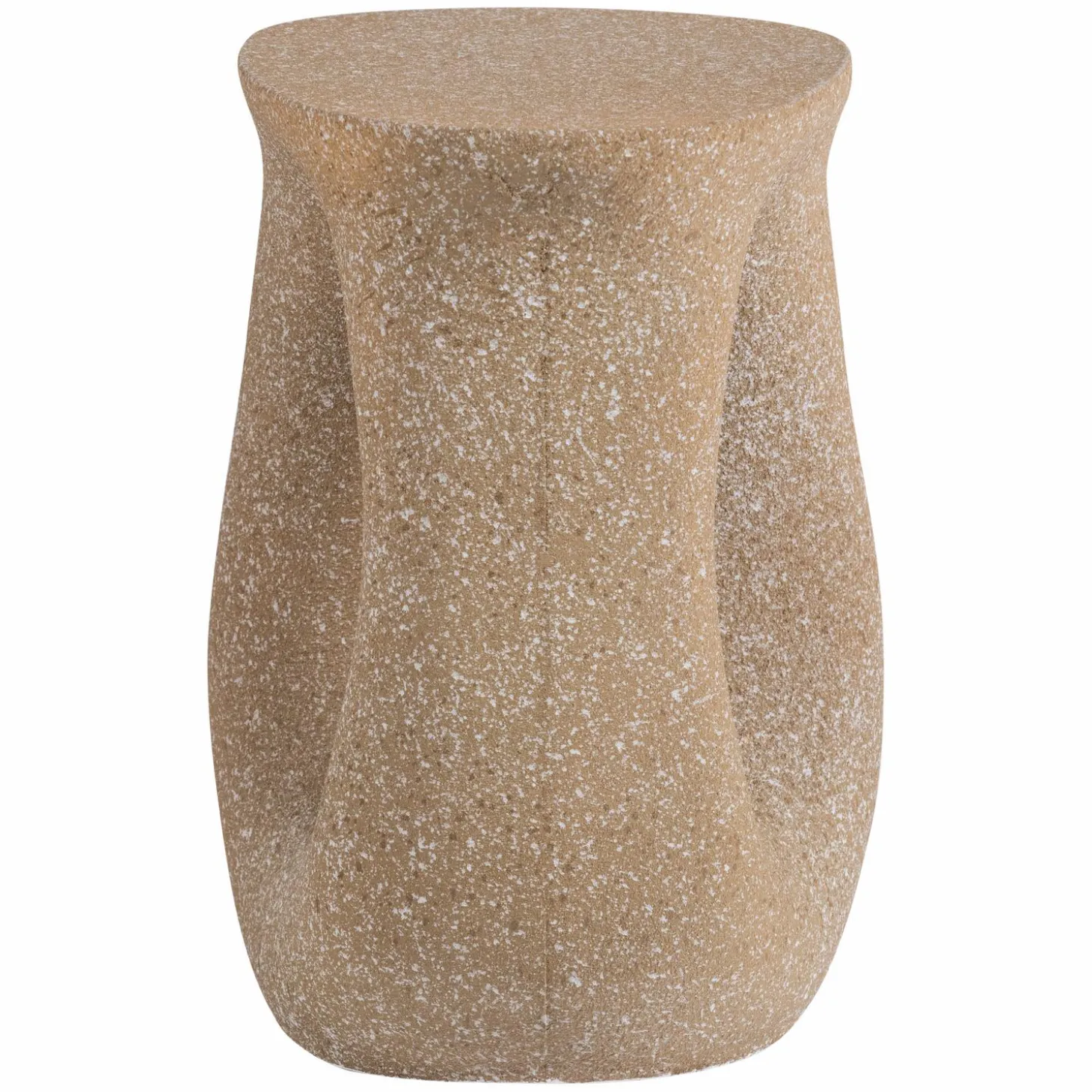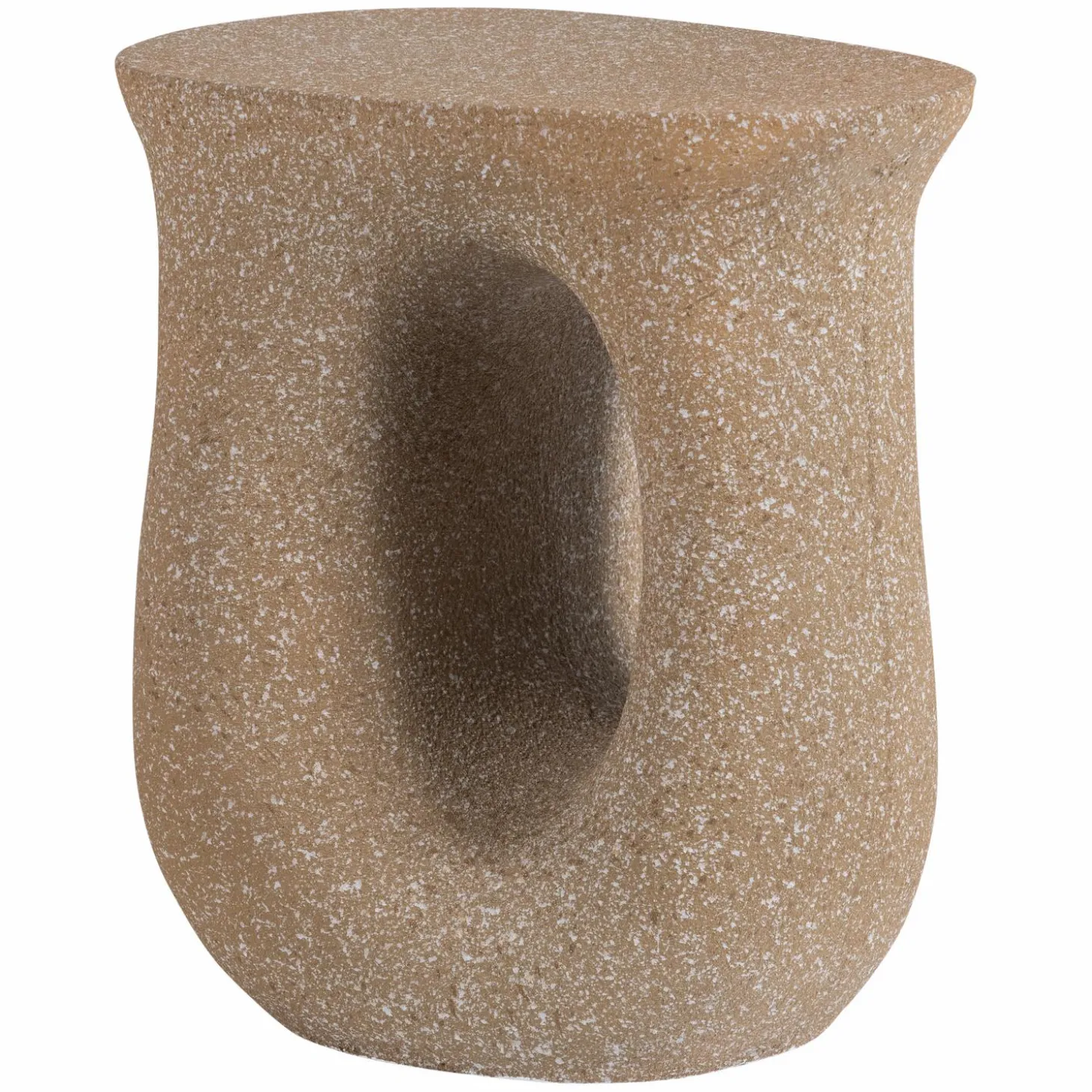Het organische, sculpturale ontwerp van deze bijzettafel zorgt voor een natuurlijke en moderne uitstraling. De vloeiende lijnen en unieke spikkelstructuur geven het meubel een ambachtelijke, artistieke look. Door zijn opvallende vorm functioneert deze tafel als decoratief accent, ook zonder spullen erop. Het ontwerp past goed bij verschillende woonstijlen en creëert een interessant focuspunt in je woonkamer, slaapkamer of terras.