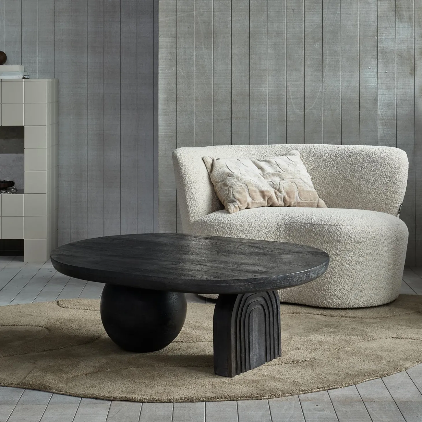 Het Stone bankje links in bouclé crème is precies dat plekje waar je helemaal tot rust komt. Met zijn organische vormen en zachte textuur voegt dit bankje direct sfeer toe aan iedere ruimte.