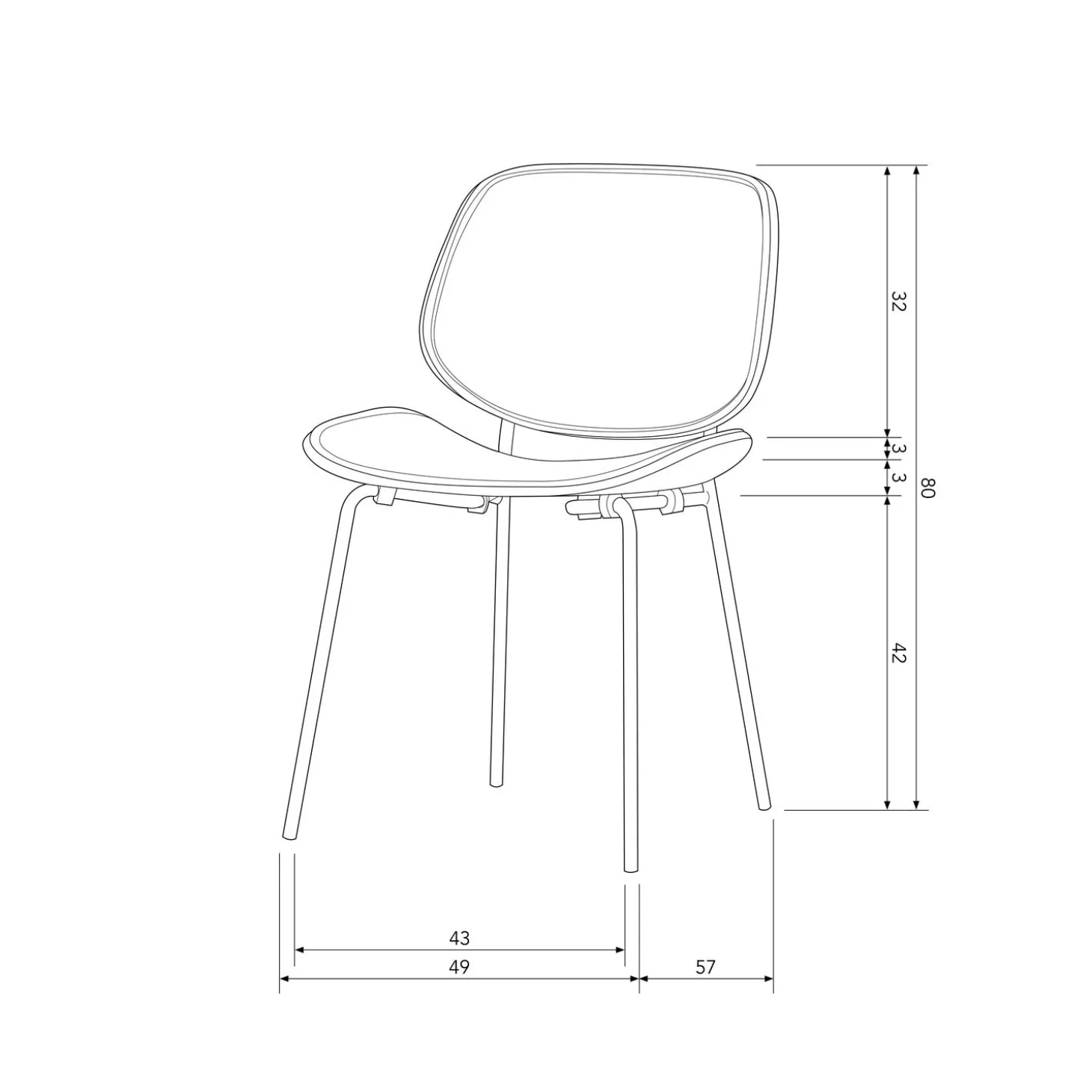 Deze eetkamerstoel heeft een zithoogte van 45 cm, een zitbreedte van 49 cm en een diepte van 40 cm. De poten hebben een hoogte van 42 cm. De hoogte van de rugleuning vanaf de zitting gezien is 37 cm en de dikte van de zitting is 3 cm. De eetkamerstoel Close in heeft een maximaal draaggewicht van 150 kg.