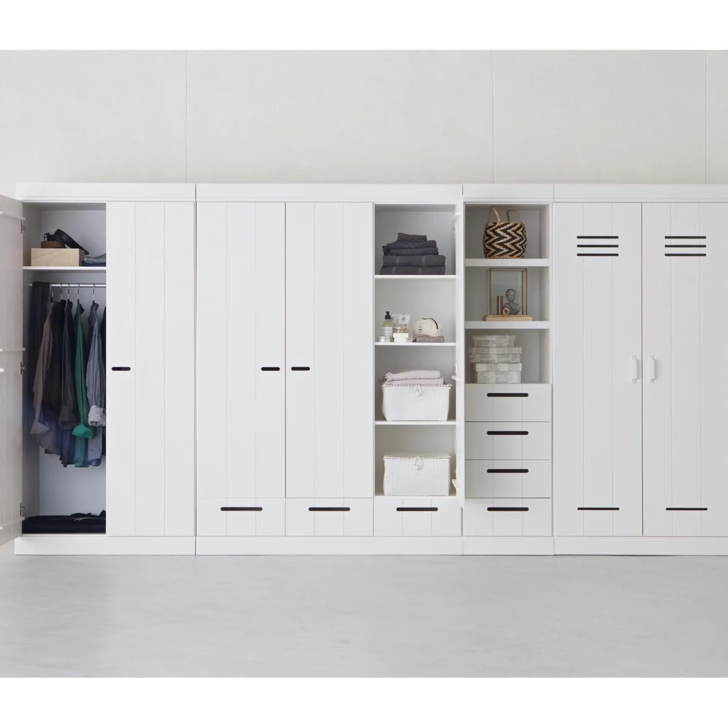 De serie CONNECT bestaat uit een ladekast en 3 basiskasten: Een 2-deurs kast, een 2-deurs kast met lades en een 3-deurs kast met lades. De kasten zijn zo gemaakt dat ze vlak tegen elkaar aan kunnen worden geplaatst en zo kun je de kastwand zo breed maken als je zelf wilt. Wij adviseren de ladenkast tussen twee kasten te plaatsen, deze kast is namelijk minder diep.