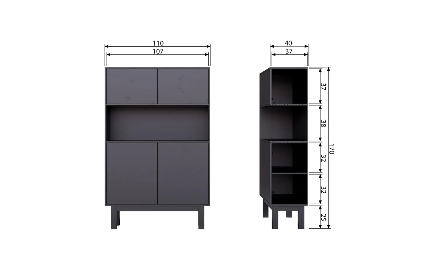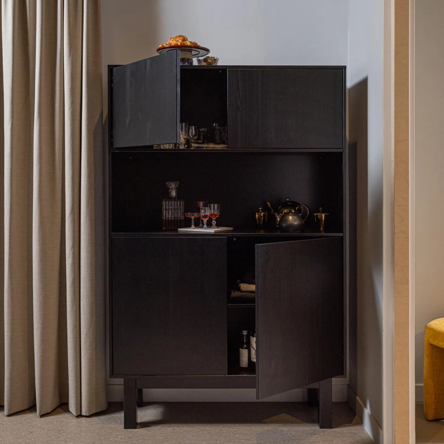 De Finca drankkast heeft vier deuren en vier royale opbergvakken. Achter de bovenste twee deuren bevindt zich een afgeschermd opbergvak van 39x108x39 cm (hxbxd). Het open vak hieronder biedt meer dan genoeg ruimte voor bijzonder glaswerk of decoratie. De twee vakken hieronder worden afgeschermd door twee deuren, deze vakken hebben een hoogte van 31 cm en strekken zich over de gehele breedte van de kast. Iedere plank heeft een draagkracht van maximaal 10 kg wanneer het gewicht gelijkwaardig verspreid is.