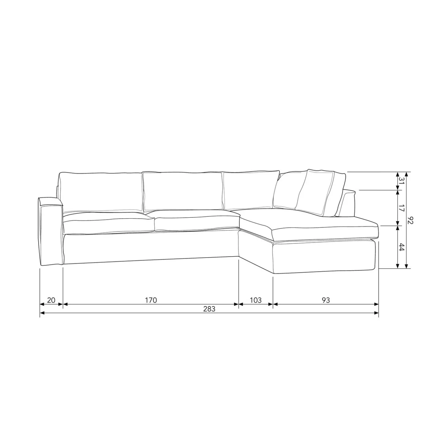 De zitdiepte van de bank is 63 cm, de totale diepte van het loungegedeelte is 197 cm. De hoogte van de armleuning is 60 cm. Deze bank wordt in losse elementen geleverd. De elementen zijn eenvoudig met elkaar te verbinden door middel van beugels. De bruine, houten blokpoten worden gemonteerd geleverd. Klikhiervoor meer informatie over het bezorgen.