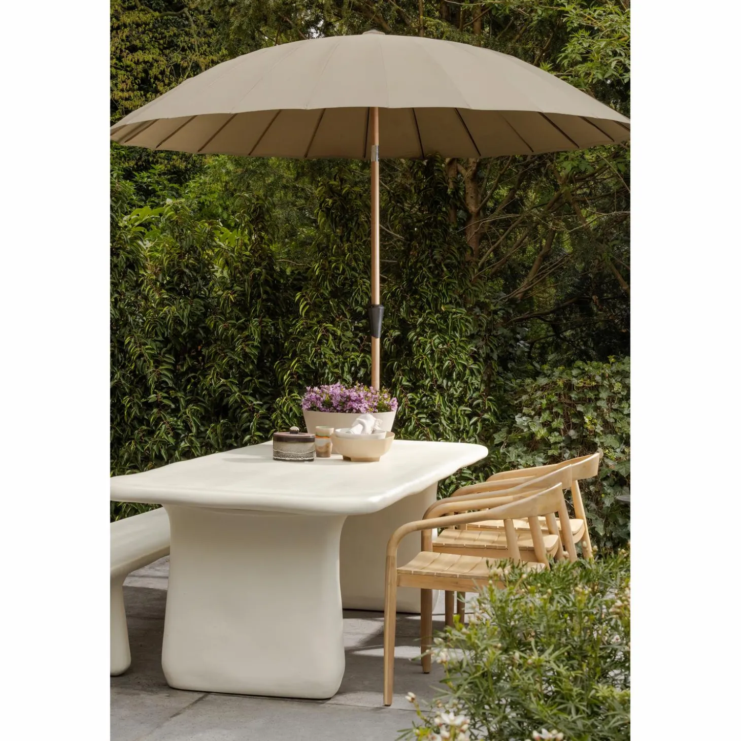 De organische vormen van dit eetbankje geven je buitenruimte een frisse, moderne uitstraling. Het gladde oppervlak en de vloeiende lijnen zorgen voor een rustige en uitnodigende sfeer. Of je nu een minimalistische tuin hebt of juist houdt van meer gezelligheid, dit bankje voegt gezelligheid toe aan je buitenruimte. Door het strakke maar warme design creëer je een plek waar je graag vertoeft.