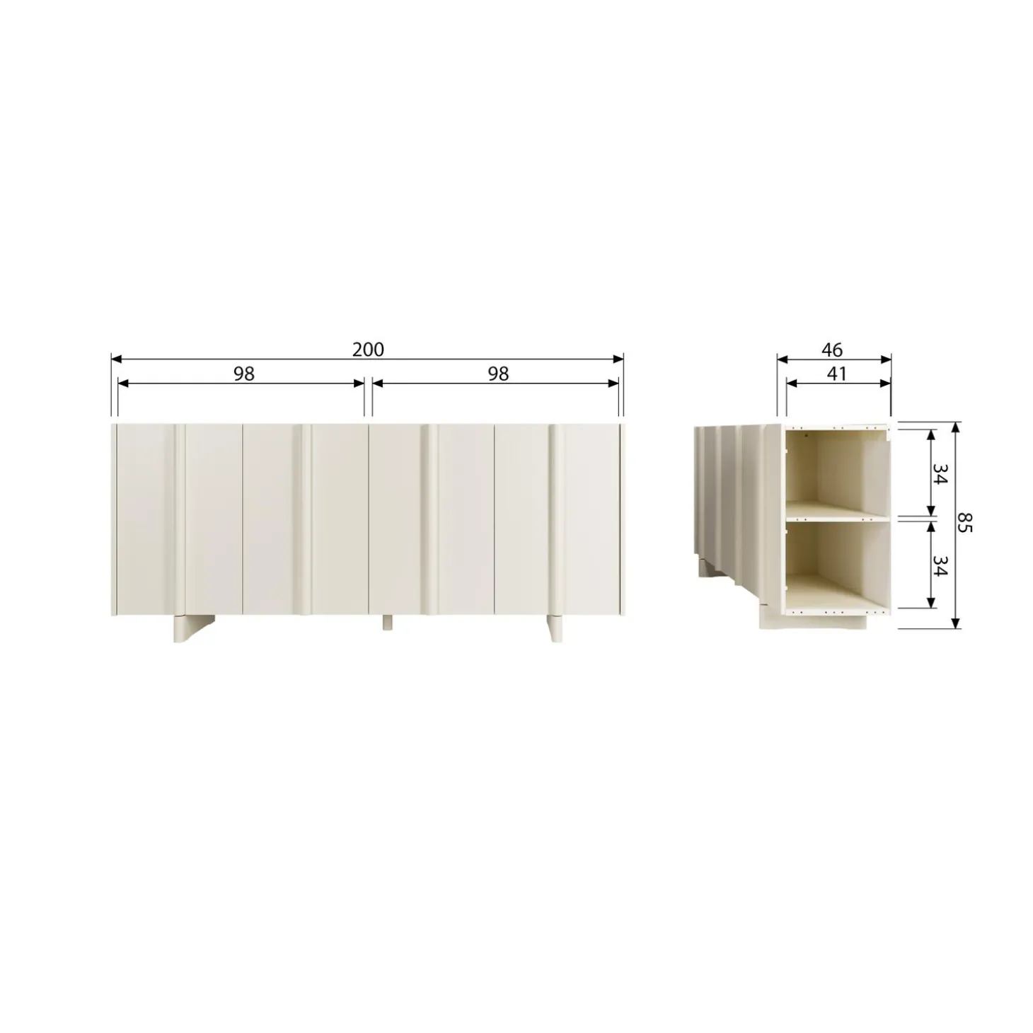 Basu heeft een hoogte van 85cm, een breedte van 200cm en een diepte van 46cm.Afmeting van de 4 kastdeuren: H 75 cm x B 50 cm en van de 8 vakkenH 33 cm x B 48 cm. Het draaggewicht van de bovenzijde is 35 kg en het draaggewicht per plank is 15 kg. Basu staat op een pootje met een hooget van 10cm.