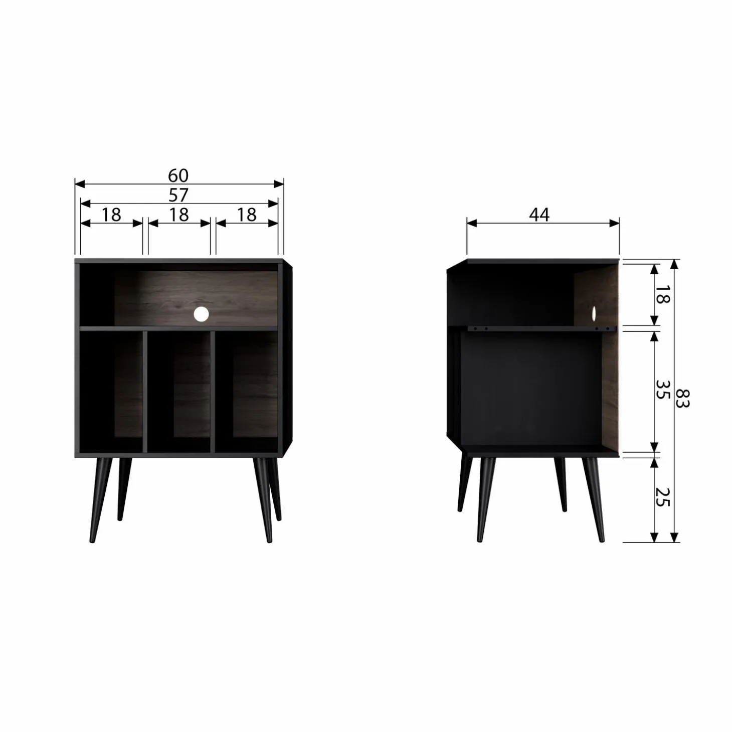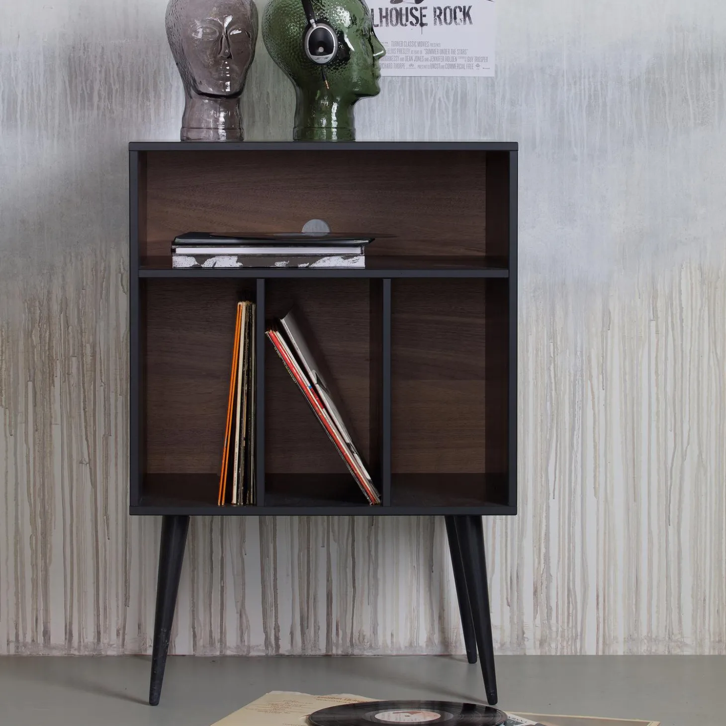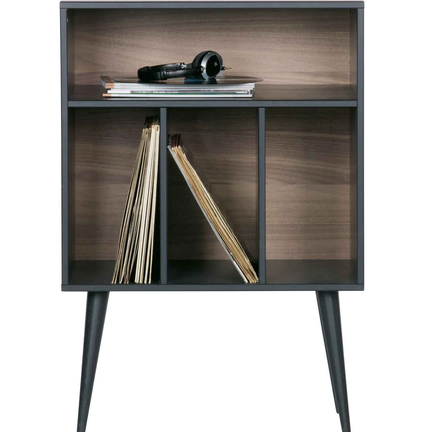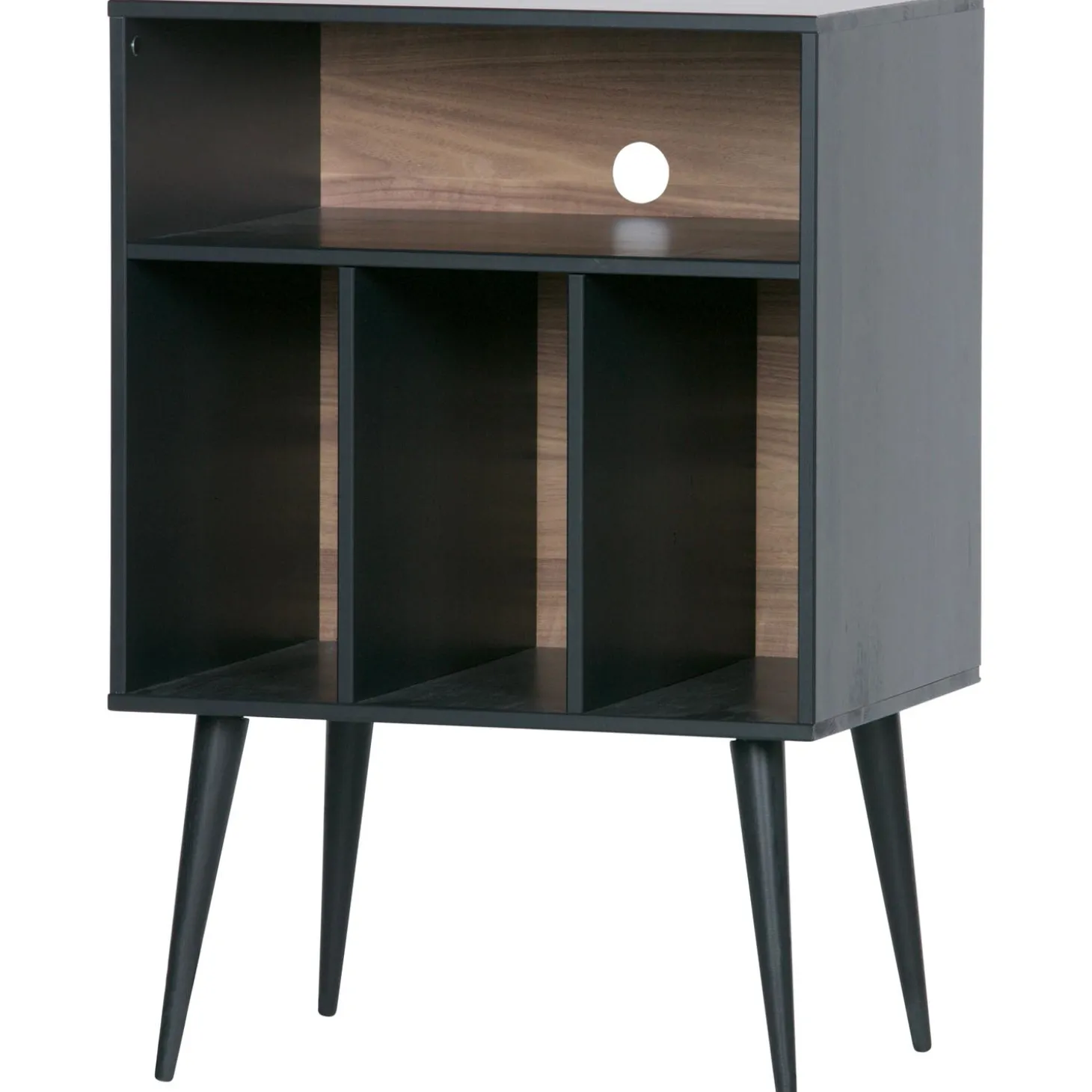 Uit de James serie van het merk WOOOD is dit bijzonder fraaie kastje. Kastje James is uitgevoerd in mat zwart gelakt grenen in combinatie met een MDF notenprint achterzijde. Het noten fineer is afgewerkt met een matte lak. Het kastje is speciaal ontwikkeld om in de 3 vakken aan de onderzijde LP’s te plaatsen ( H 35 x B 18 cm). Het brede vak bovenin is ontworpen om de versterker in te plaatsen, daar is namelijk een gat in de achterzijde van het kastje gemaakt om je snoeren doorheen te halen. Je kunt het kastje natuurlijk ook gebruiken voor andere functies! Denk bijvoorbeeld aan een handig kastje in de hal, of een prachtig kastje voor naast je bed..