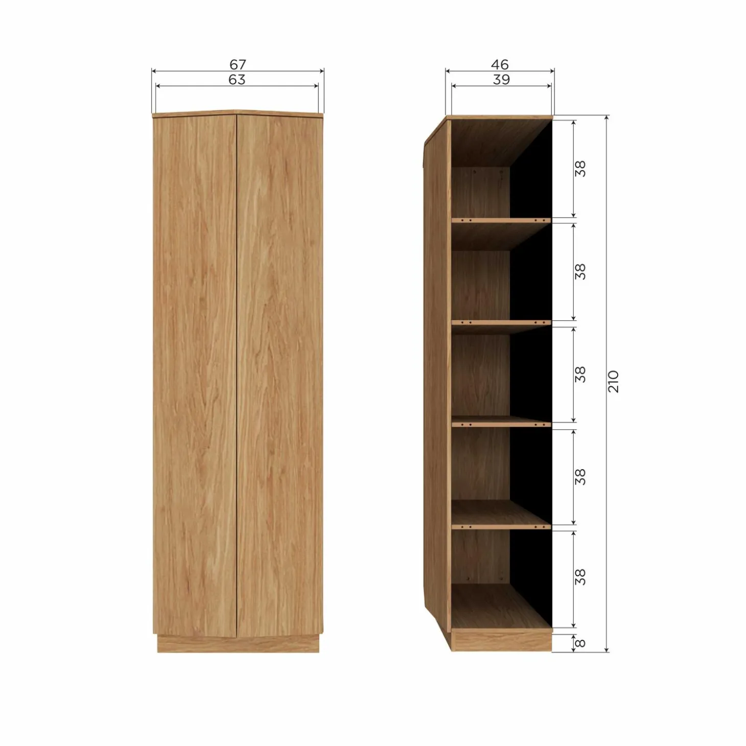 De kast heeft een hoogte van 210 cm, een breedte van 67 cm en een diepte van 46 cm. De afmetingen van de kastdeuren zijn 200 cm hoog, 33,1 cm breed en 1,7 cm diep. De 10 vakken hebben een afmeting van 38,4 cm hoogte, 32,8 cm breedte en 39,2 cm diepte. Het draaggewicht per plank is 10 kg, gelijk verdeeld. De plinthoogte is 8 cm en het totale gewicht van de kast bedraagt 57 kg.