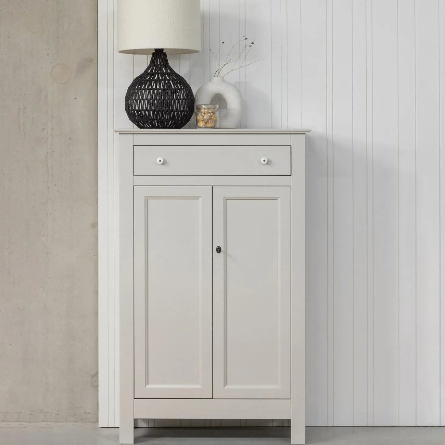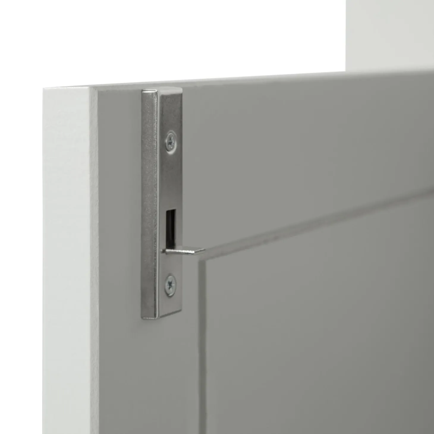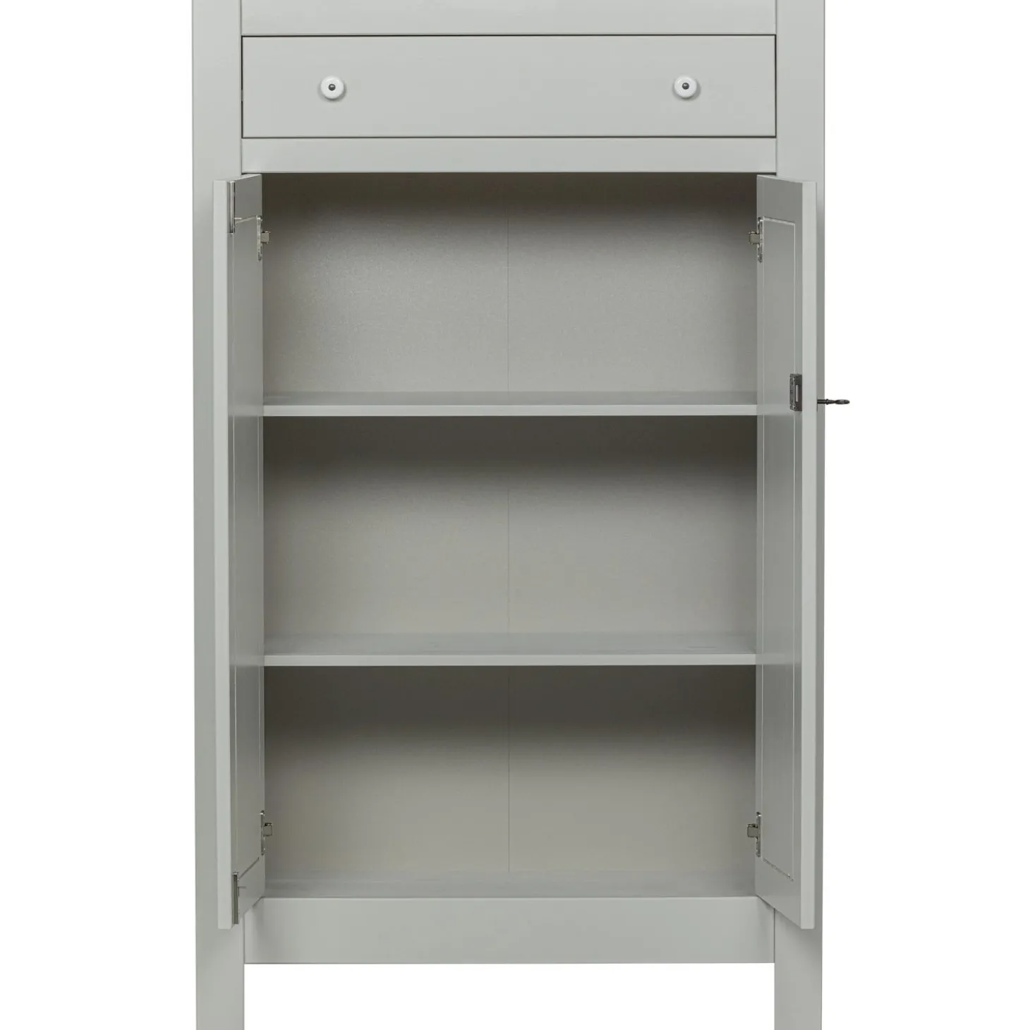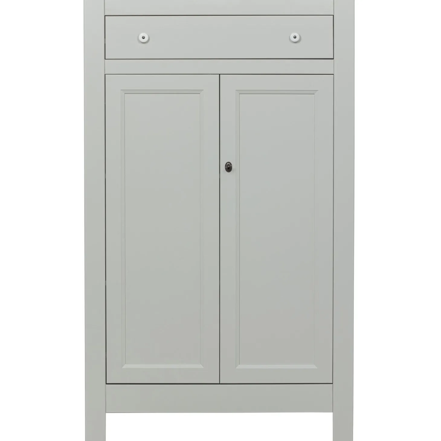 Het interieur van deze kast is gemaakt van gemelamineerd spaanplaat en de handige lade bovenin, met 2 witte porseleinen knoppen, is voorzien van solide metalen ladegeleiders. De binnenkant van de kast is ingericht met 3 brede legplanken. De twee deuren in de kast zijn voorzien van een slot en sleutel. Deze wandkast bied je genoeg opbergruimte voor alle spullen die je niet graag laat zien.