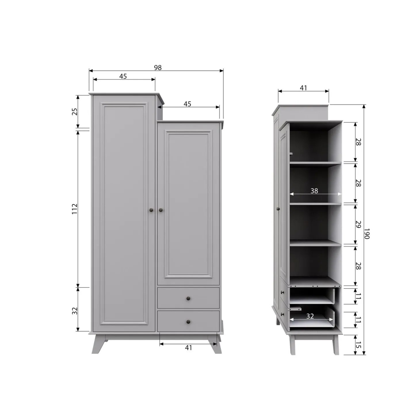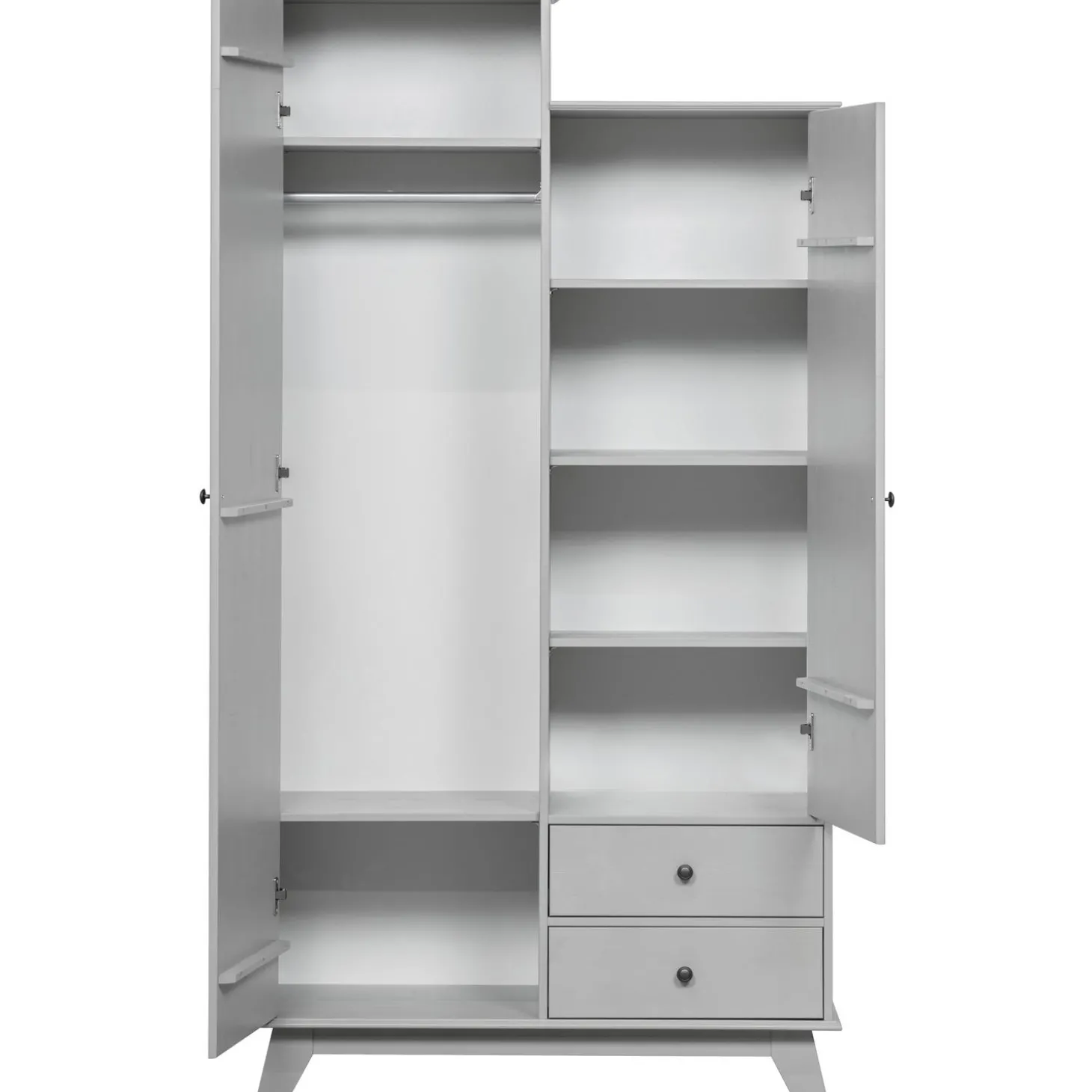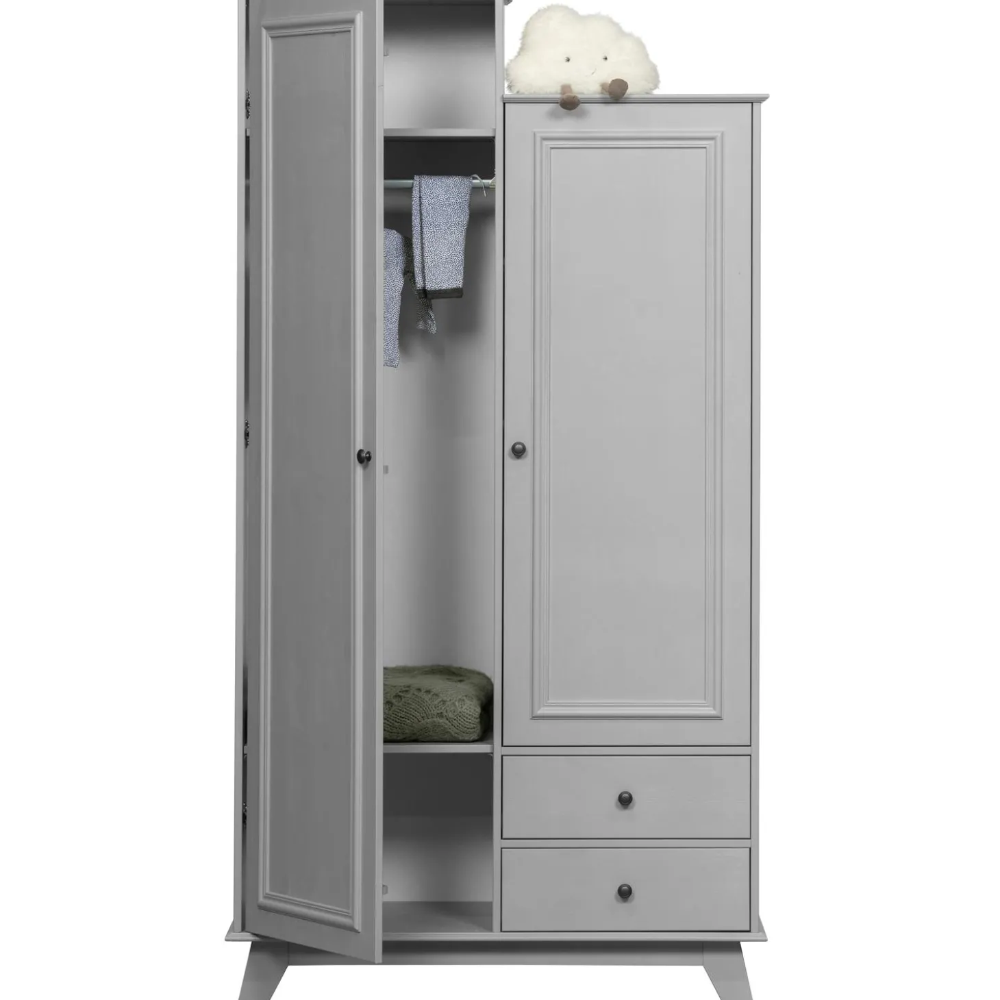 Wat een plaatje! Deze romantische, speelse garderobekast Lily is een eigen ontwerp uit de WOOOD collectie. Deze garderobekast brengt direct een gezellige sfeer in je interieur. De kast is gemaakt van warmgrijs, gelakt grenenhout dat afkomstig is van een FSC gecertificeerde leverancier. Het interieur van deze kast is gemaakt van gemelamineerd spaanplaat. De linkerzijde van de kast is voorzien van een hanggedeelte (112cm), waarbij zich daarboven (25 cm) en onder (32 cm) ruimte bevindt om spullen op te bergen. De rechterkant van de kast is ingericht met 3 brede legplanken (45cm) met een diepte van 38cm. De twee lades die zich onder de rechterdeur bevinden zijn voorzien van ladegeleiders, hebben een diepte van 32 cam en een breedte van 41 cm. Genoeg ruimte om spullen in op te bergen die je liever niet hebt rondslingeren in de kinderkamer.