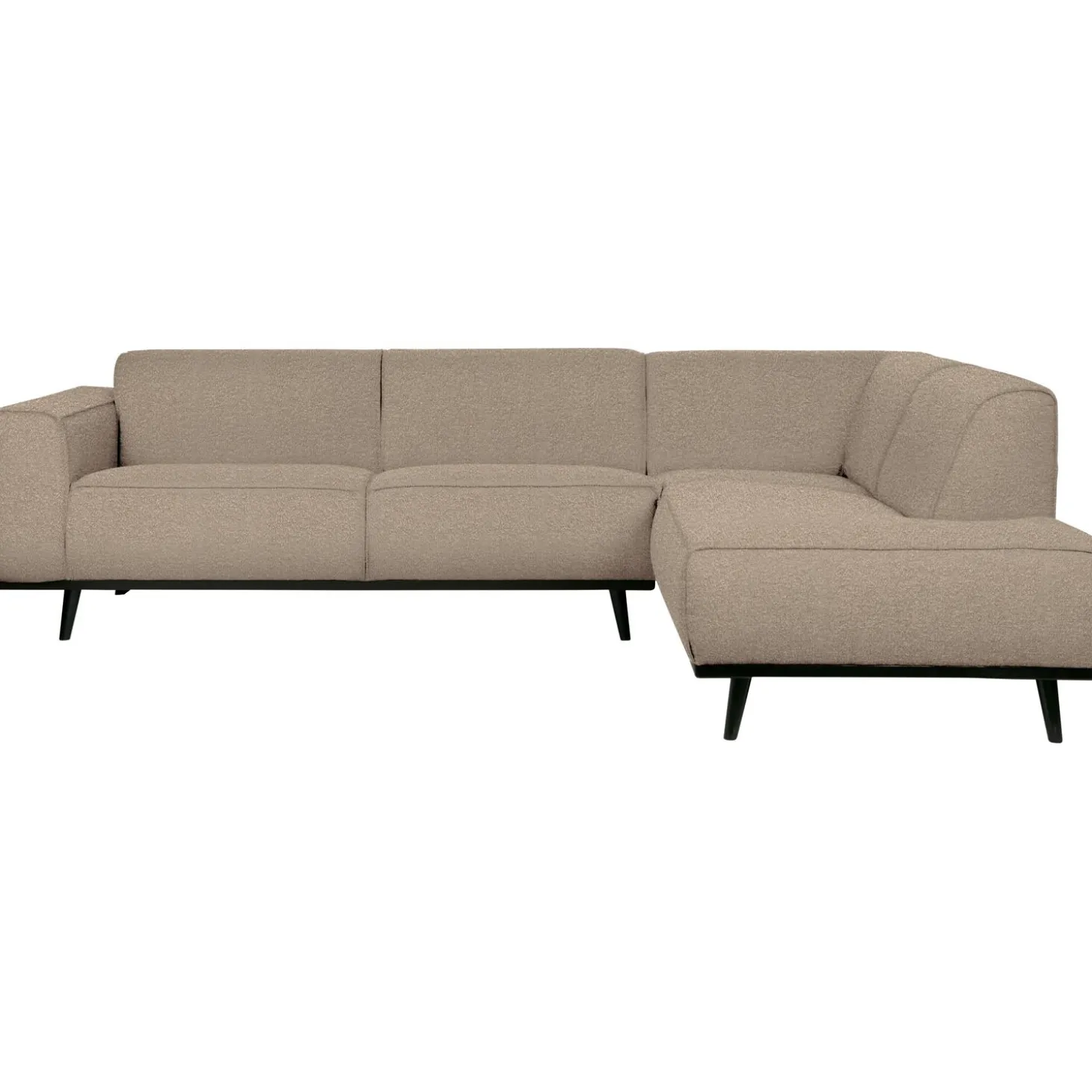 De naam van deze bank zegt genoeg, toch? Een bank als deze staat als een duidelijk element in huis. Een bank bepaalt de sfeer van het interieur en deze bank biedt een goede basis voor meerdere woonstijlen. Het design van Statement is basic, maar valt door de omvang natuurlijk wel op. Deze hoekbank Statement heeft zitruimte genoeg, zit heerlijk en is verkrijgbaar in een rechter- en linkervariant. Als je voor de bank staat en de hoek zit rechts, betreft het de rechtervariant. Deze bank Statement uit de collectie van WOOOD, is puur en stoer en bestaat uit meerdere varianten, stoffen en kleuren. Deze variant is voorzien van een zachte bouclé stof in de rustige kleur beige. Super aaibaar en brengt een warme sfeer in huis.De stof boucléheeft een volle zware kwaliteit en is geschikt voor intensief gebruik.
