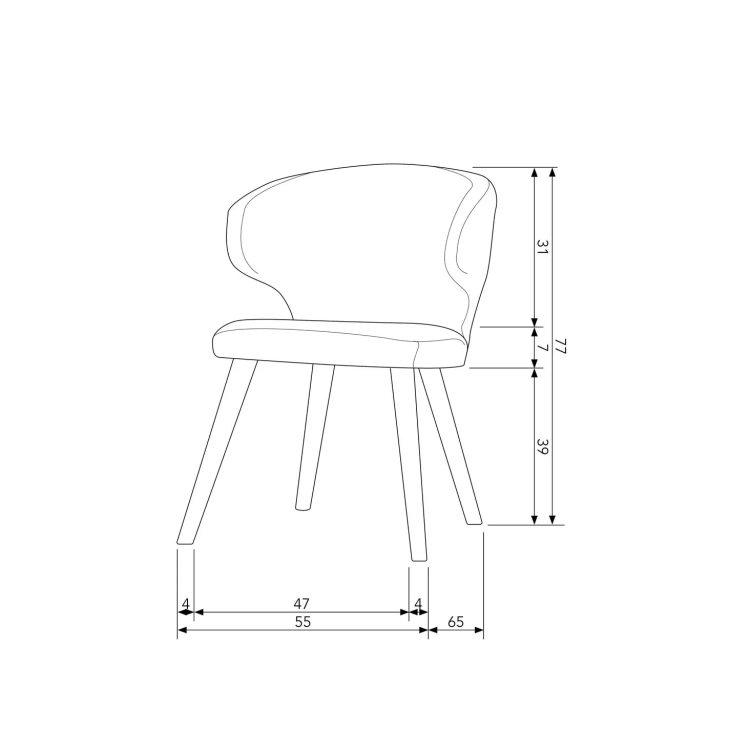 De Cape eetkamerstoel heeft een hoogte van 77 cm, breedte van 55 cm en diepte van 65 cm. De zithoogte is 46 cm. De zitbreedte van 47 cm en zitdiepte van 45 cm in combinatie met de iets hollende rugleuning zorgt dit voor een geborgen gevoel en comfortabele zit. Urenlang tafelen is dus gegarandeerd! De vier houten poten hebben een hoogte van 39 cm en een diameter van 3,5 cm. De afstand tussen de twee voorpoten is 54 cm gemeten op de vloer, bovenaan is dit 40 cm. De afstand tussen een voor – en achterpoot is aan de vloerzijde 56 cm en onderaan de zitting gemeten 36 cm. De maximale draagkracht van de Cape eetkamerstoel is 160 kg.