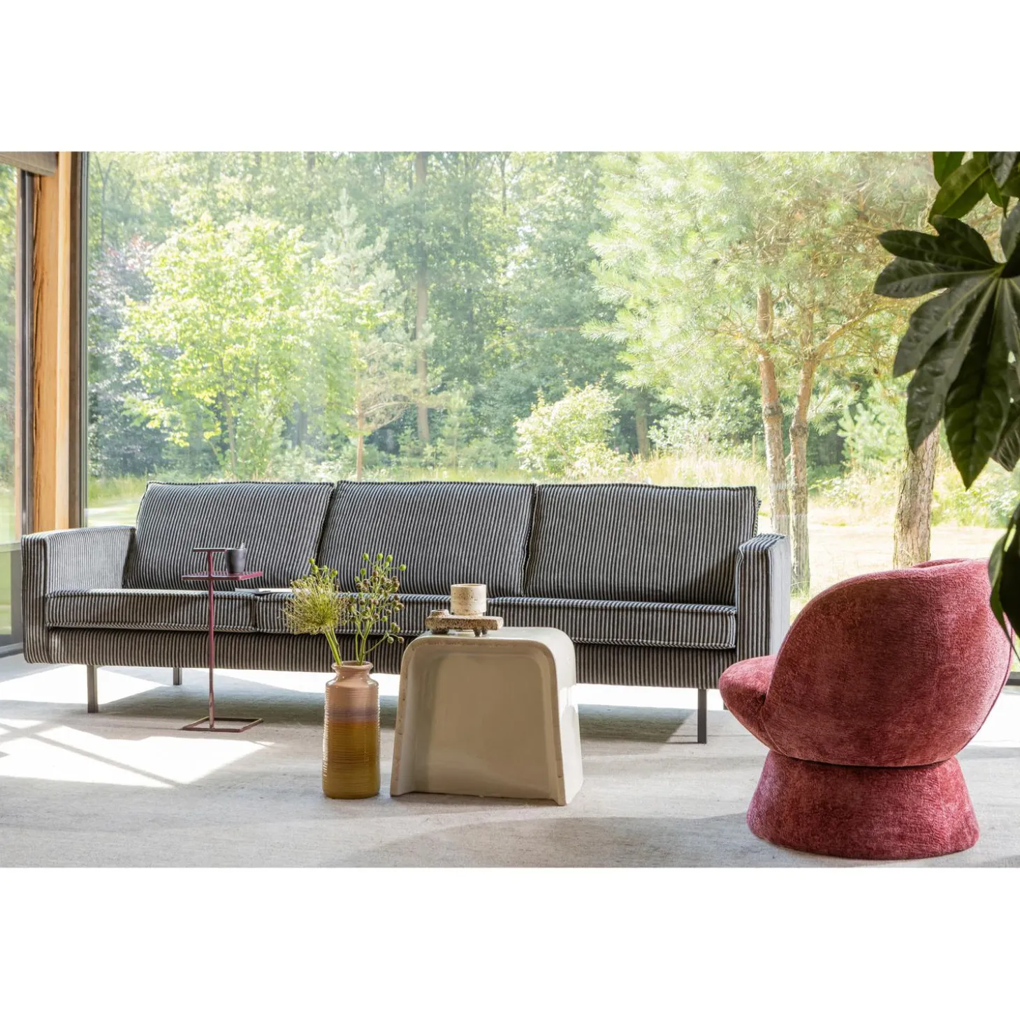 De geweven stof heeft een prachtig streeppatroon en een verfijnde textuur die direct een warme sfeer aan elke ruimte toevoegt. Met een Martindale van 30.000 is deze stof geschikt voor normaal gebruik. De combinatiestof bestaat uit 48% polyester, 31% rayon en 21% katoen, de gebruikte weeftechniek geeft de stof een volle en rijke uitstraling. De combinatie van deze stof met de zwart metalen slanke poten maakt Vogue eigentijds en uniek.