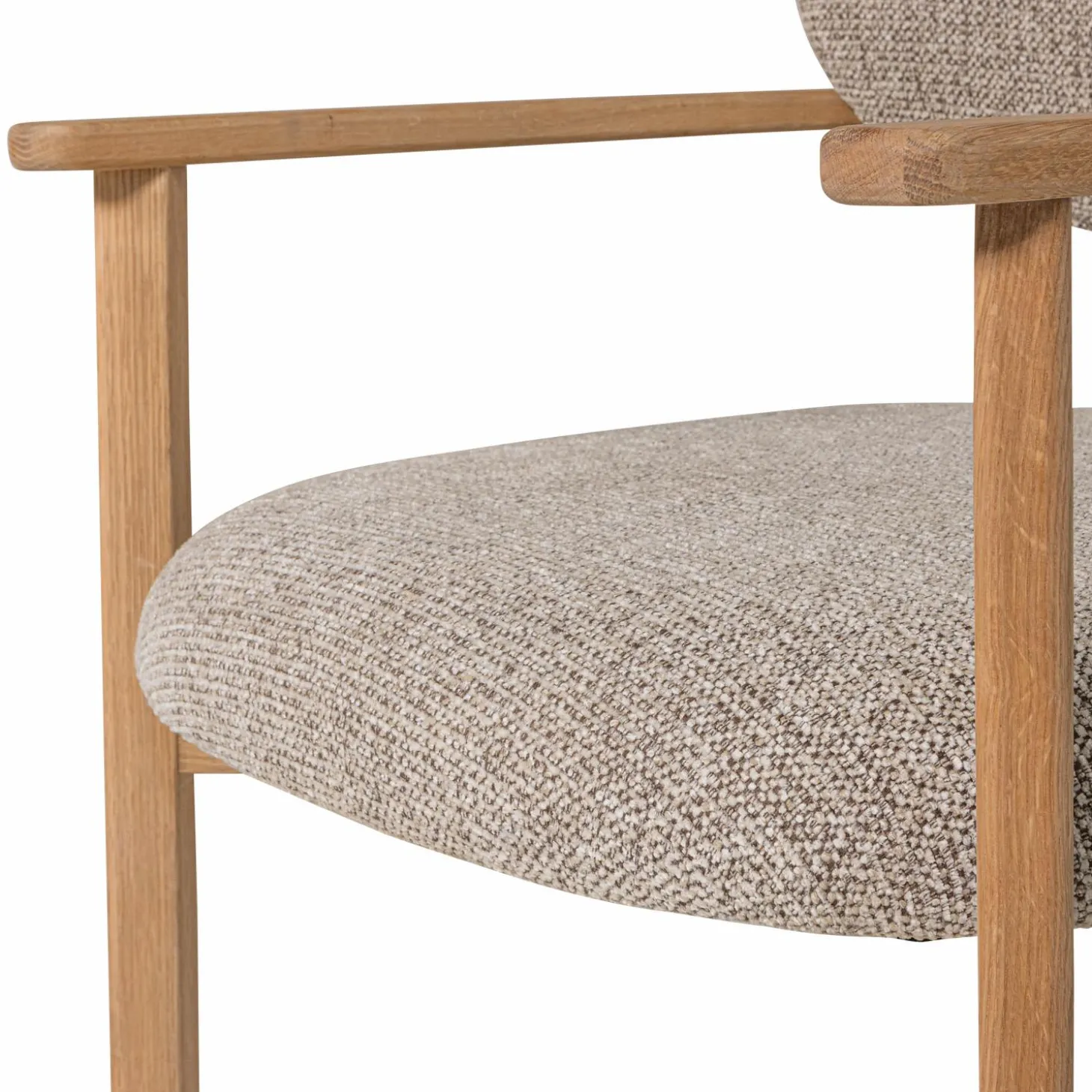 Het eikenhout onderstel straalt pure luxe uit, terwijl de geweven stof (100% polyester) zorgt voor dat perfecte comfort waar je naar verlangt. Met een zithoogte van 42 cm en breedte van 62 cm biedt deze fauteuil de ideale balans tussen stijl en functionaliteit.