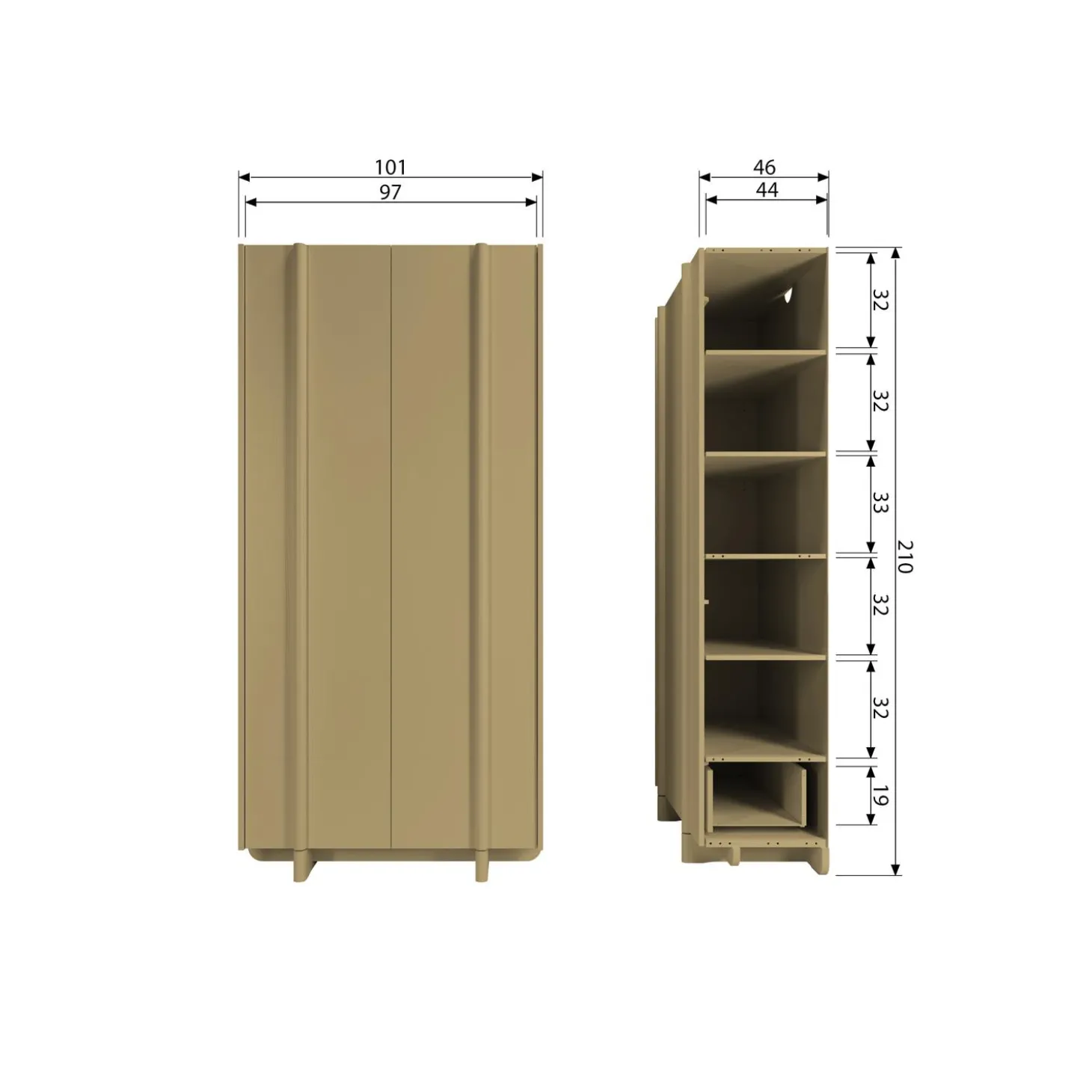 Basu heeft een hoogte van 210cm, een breedte van 101cm en een diepte van 46cm. Afmeting van de 2 kastdeurenH 200 cm x B 50 cm en afmetingen van de 5 vakken: H 33 cm x B 96 cm. De lade heeft een afmeting van H 30 x B 90 cm. Draaggewicht per plank is 15 kg, draaggewicht van de lade is 10 kg.Poothoogte: 10 cm.