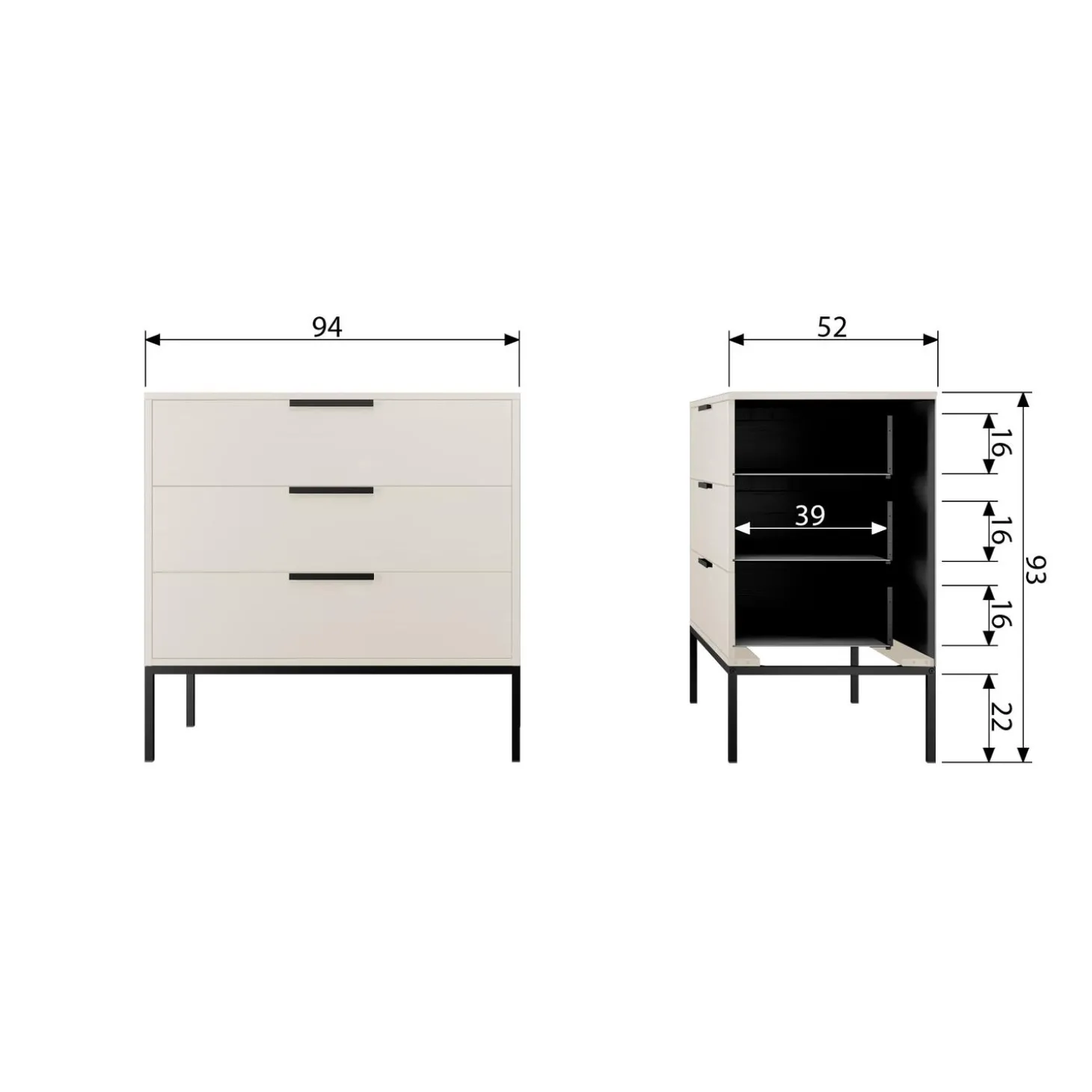 De lades van de ladenkast Adam hebben een hoogte van 22 cm en een breedte van 90 cm. Hierdoor hebben ze genoeg ruimte om alle spullen in op te bergen die je niet wilt zien. Let wel op met het sluiten van de lades want, de lades hebben een normale ladegeleider en zijn niet voorzien van softclose. Het maximale draaggewicht per lade is 15 kg. De poothoogte is 24 cm, deze is gemaakt van staal met een mat zwarte poedercoating.