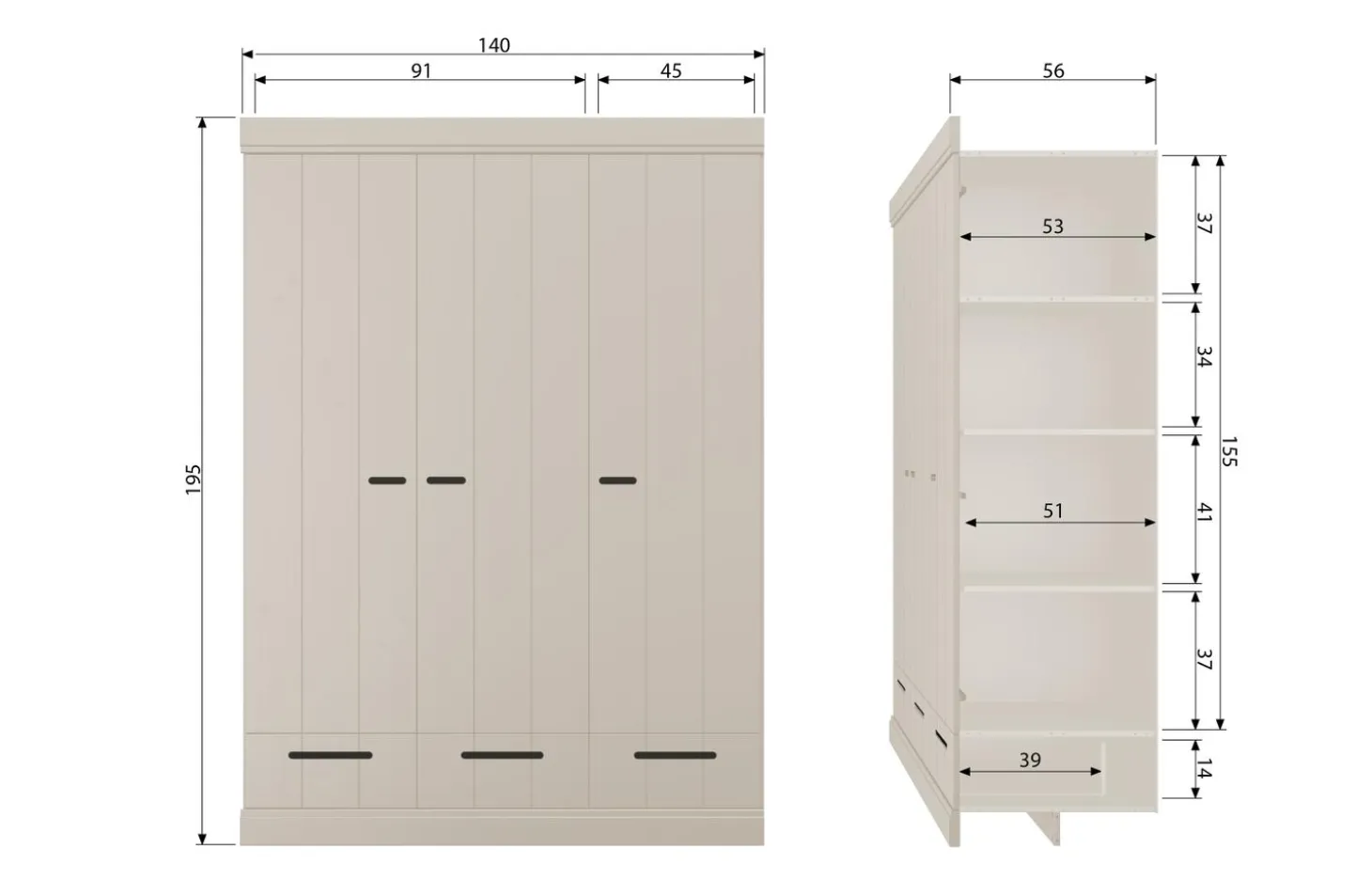 De Connect 3-deurs kasten beschikken over een breed hang-/leg interieur (1 roede + 1 legplank) en achter de rechterdeur 3 gedeelde legplanken. Als jemeer legplanken wenst dan is er voordeze kast een extra interieurpakket verkrijgbaar. In het hanggedeelte komt dan een extra tussenschot met 2 extra legplanken. De hoogte van de kast is 195cm, de breedte 140cm en de diepte 53cm. De lades hebben een hoogte van 20c, een breedte van 46cm en een diepte van 52cm. De hoogte van de roede is 108cm. Hoogte van het hanggedeelte is 115cm, de breedte 91cm en de diepte 52cm. De planken hebben een draaggewicht van 15 kg per plank.