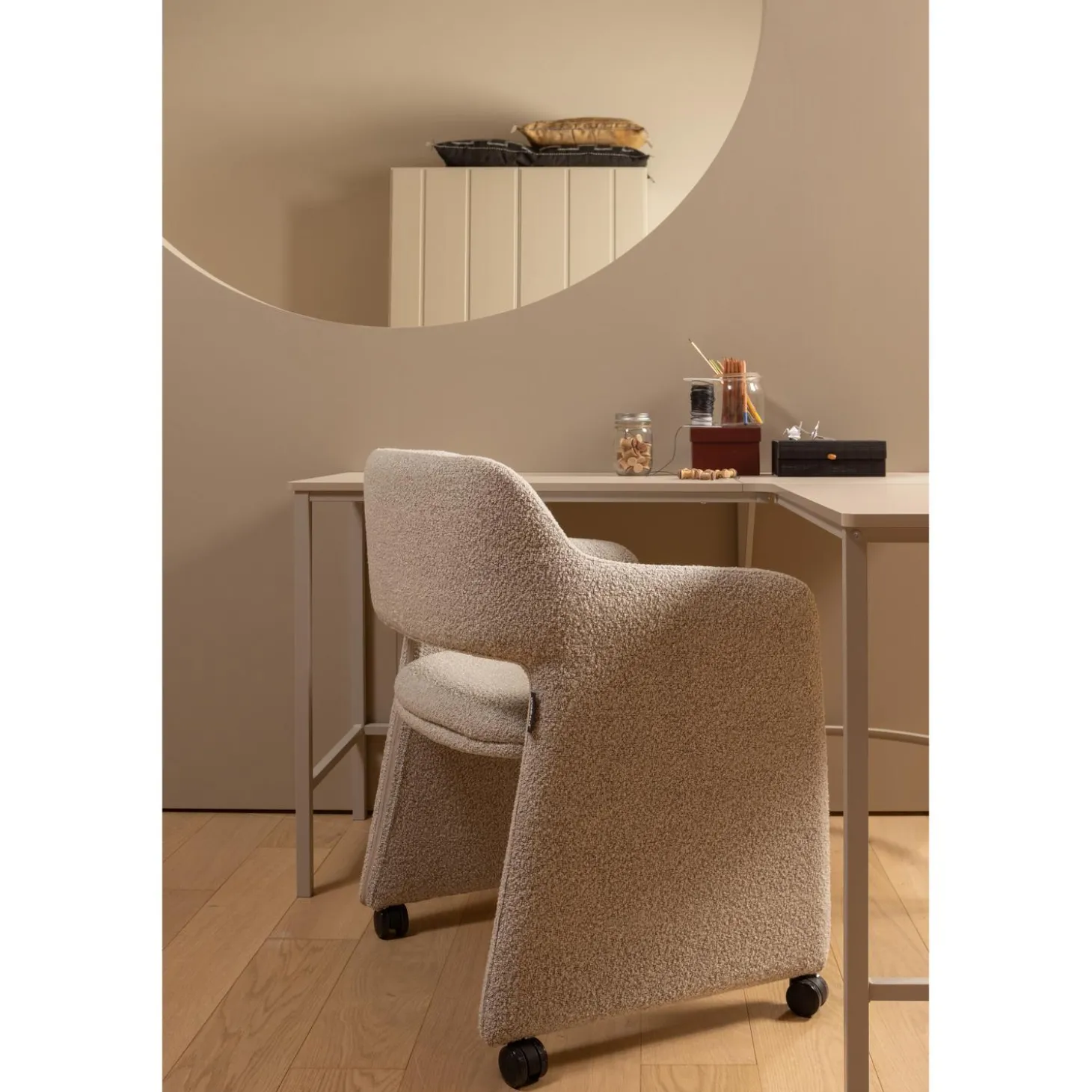 De stoel is bekleed met een hoogwaardige bouclƩ stof die niet alleen zacht en gezellig aanvoelt, maar ook een rijke textuur heeft. Door de melange van kleuren en de bijzondere weeftechniek krijgt de stof een speels 3D-effect. Dankzij de sterke polyestervezels is hij slijtvast en ideaal voor dagelijks gebruik.