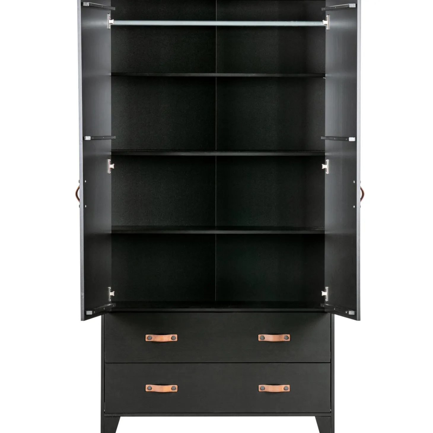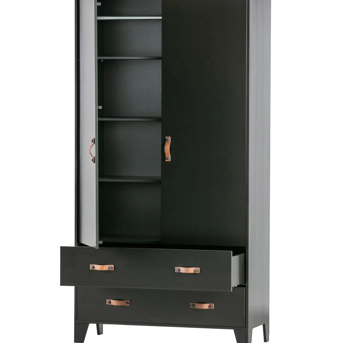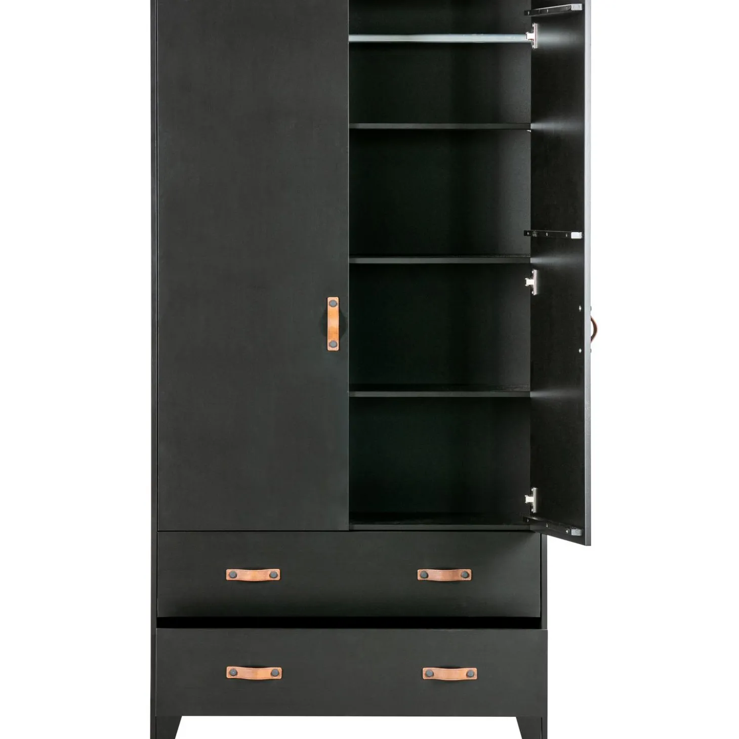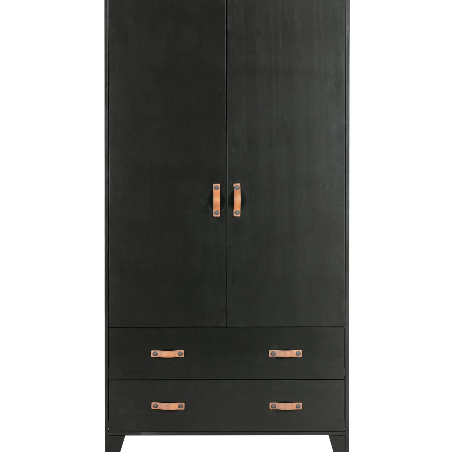 Op zoek naar een tikkeltje stoer voor de kinderkamer? Deze Dian garderobekast is dan helemaal wat je zoekt. Dankzij de bruine leren grepen is de kast eigentijds, stoer en een tikkeltje anders. Dian is een eigen ontwerp en komt uit de collectie van het merk WOOOD. De garderobekast is gemaakt van grenen dat is afgewerkt in een stoere zwarte kleur. De kast is voorzien van twee lades met twee leren grepen per lade en twee deuren met een leren greep. Dit zorgt voor genoeg opbergruimte. Door de moderne, stoere uitstraling past deze kast in vele slaapkamers thuis!