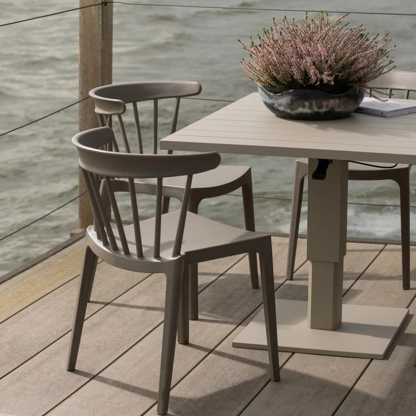 Het strakke aluminium design straalt moderne elegantie uit en past bij verschillende buitenstijlen. De eenvoudige lijnen en zand kleur zorgen voor een rustige, tijdloze uitstraling die mooi combineert met verschillende materialen. Door de verstelbare hoogte transformeer je de tafel van loungetafel naar eettafel, zo pas jij je moeiteloos aan. Het compacte formaat maakt het perfect voor kleinere terrassen en balkons.