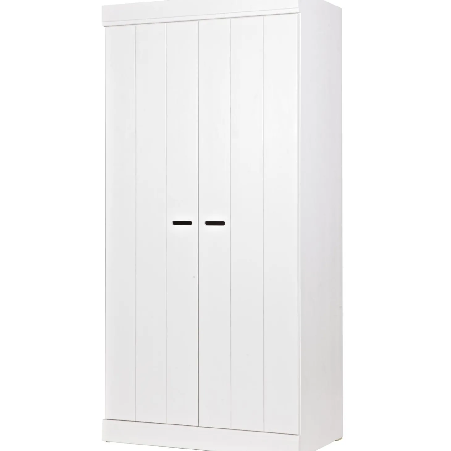 Uit de serie CONNECT; een stoere basic 2-deurs kledingkast met strakke sokkel en koof gecombineerd metstrokendeuren met sleufgrepen. Met de CONNECT kasten kun je je eigen kastenwand bouwen! De romp van de CONNECT kledingkast is gemaakt van massief grenenhout dat afkomstig is van een FSC gecertificeerde leverancier. De binnenzijde is voorzien van gemĆŖlamineerde legplanken, praktisch met schoonmaken! De kasten zijn in de kleur wit gespoten, maar je schildert ze zelf binnen een handomdraai ook in een andere kleur (gebruik in dat geval watergedragen lak).