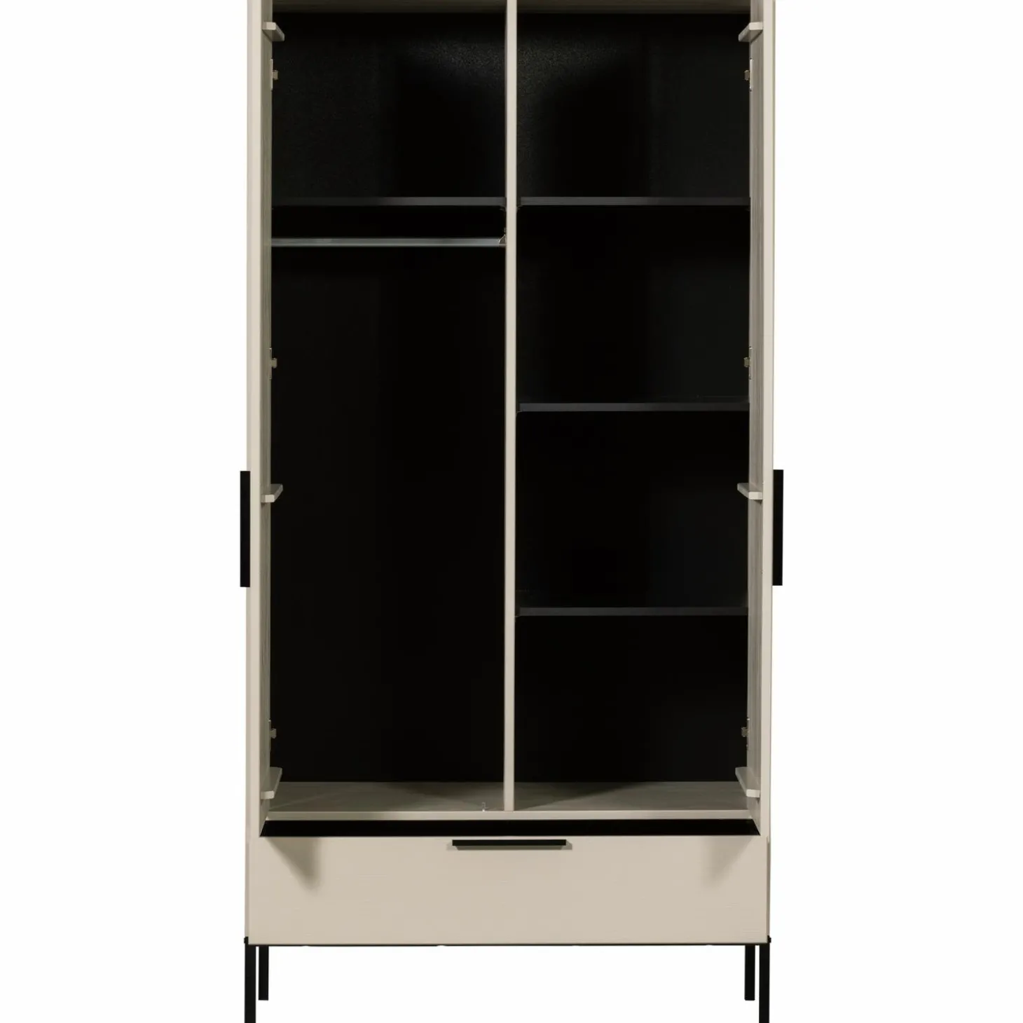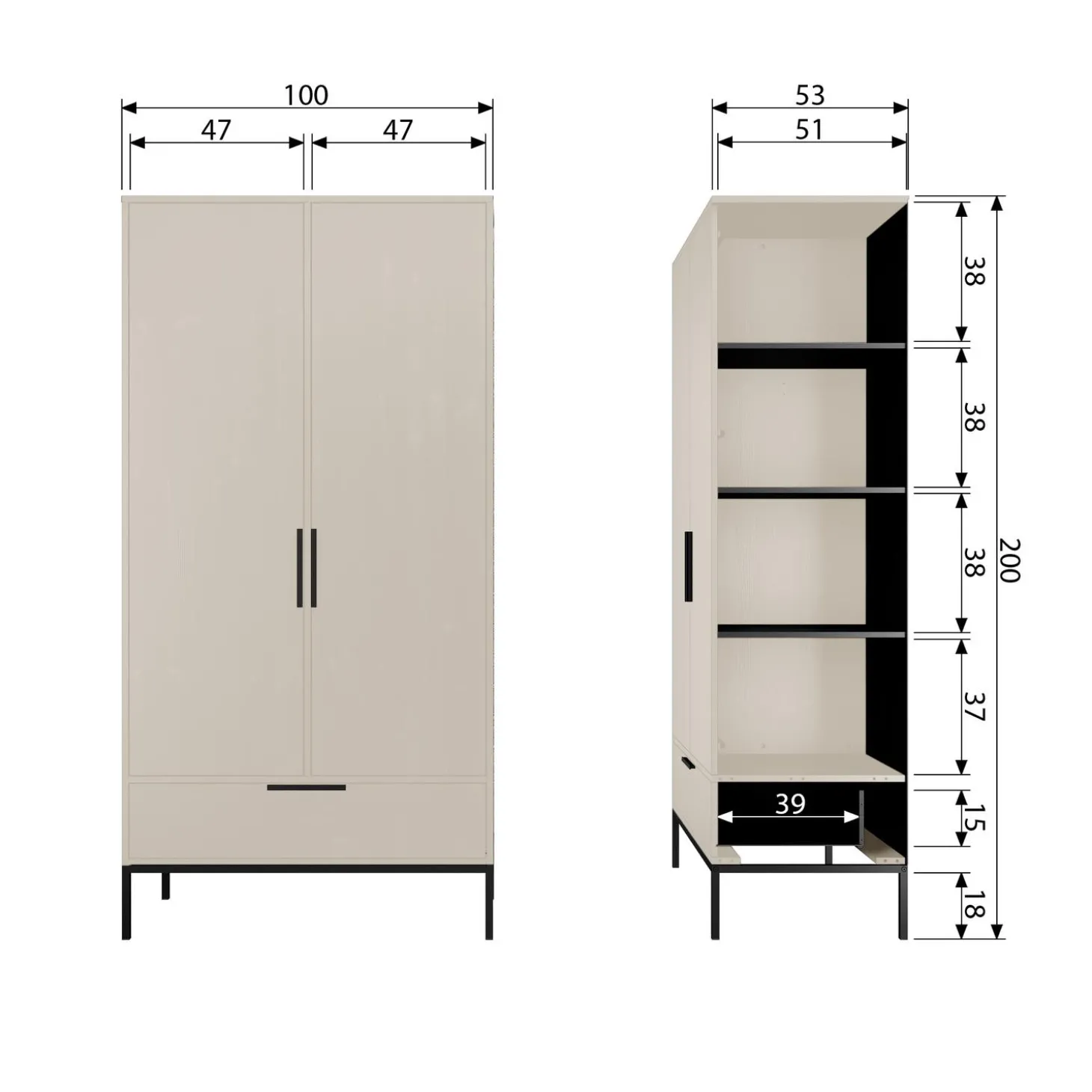 De 2-deurs Adam kast is 200 cm hoog, 100 cm breed en 53 cm diep. De vier open vakken hebben een hoogte van 38 cm, breedte van 47 cm en diepte van 51 cm. Het bovenste vak beslaat de gehele breedte van de kast (100 cm breed). De lade heeft een rolbegeleider en ieder een inhoud van 15x47x39 cm (hxbxd). Het royale hanggedeelte heeft een hoogte van 133 cm en een breedte van 47 cm.
