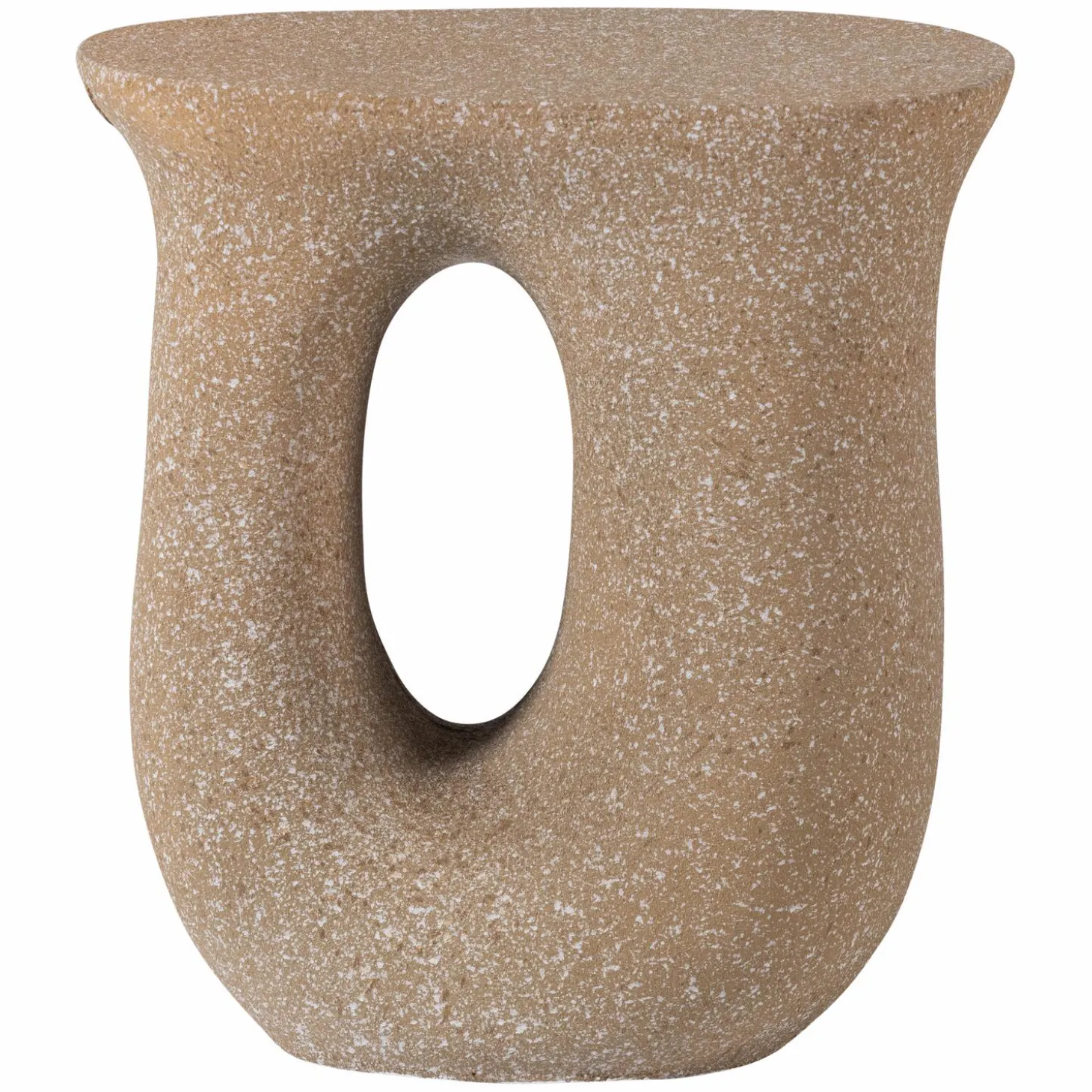 Het organische, sculpturale ontwerp van deze bijzettafel zorgt voor een natuurlijke en moderne uitstraling. De vloeiende lijnen en unieke spikkelstructuur geven het meubel een ambachtelijke, artistieke look. Door zijn opvallende vorm functioneert deze tafel als decoratief accent, ook zonder spullen erop. Het ontwerp past goed bij verschillende woonstijlen en creëert een interessant focuspunt in je woonkamer, slaapkamer of terras.