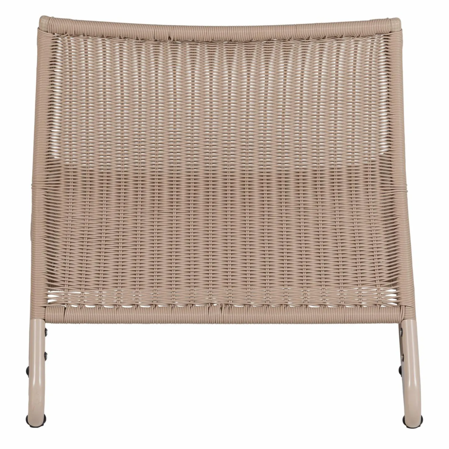 De loungestoel is gemaakt van kunststof met een gevlochten structuur die zorgt voor een aantrekkelijke uitstraling. Het weerbestendige materiaal kan tegen verschillende weersomstandigheden en behoudt zijn kwaliteit tijdens het buitenseizoen. De combinatie van kunststof en metaal zorgt voor een stevige en betrouwbare constructie.