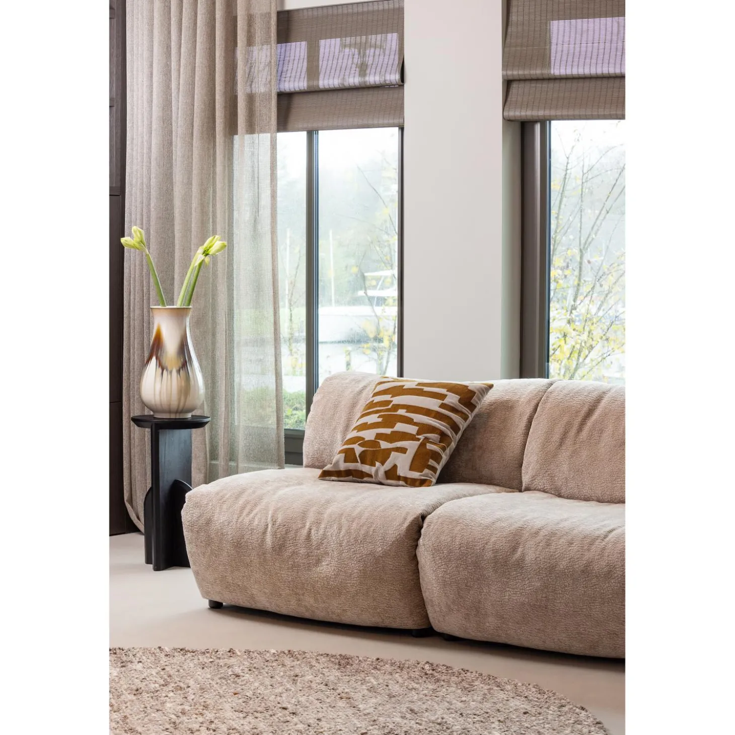 De stof voelt zacht en comfortabel aan. De stof is gemaakt van 100% polyester en heeft een uniek 3D-patroon met een onregelmatige, golvende structuur. Dit zorgt voor extra diepte en een speels effect in het meubelstuk. Daarnaast heeft de stof een luxe, matte glans die de uitstraling verfijnd en stijlvol maakt. Met een Martindale van 100.000+ is deze stof sterk en slijtvast, wat bijdraagt aan een lange levensduur en duurzaam gebruik.