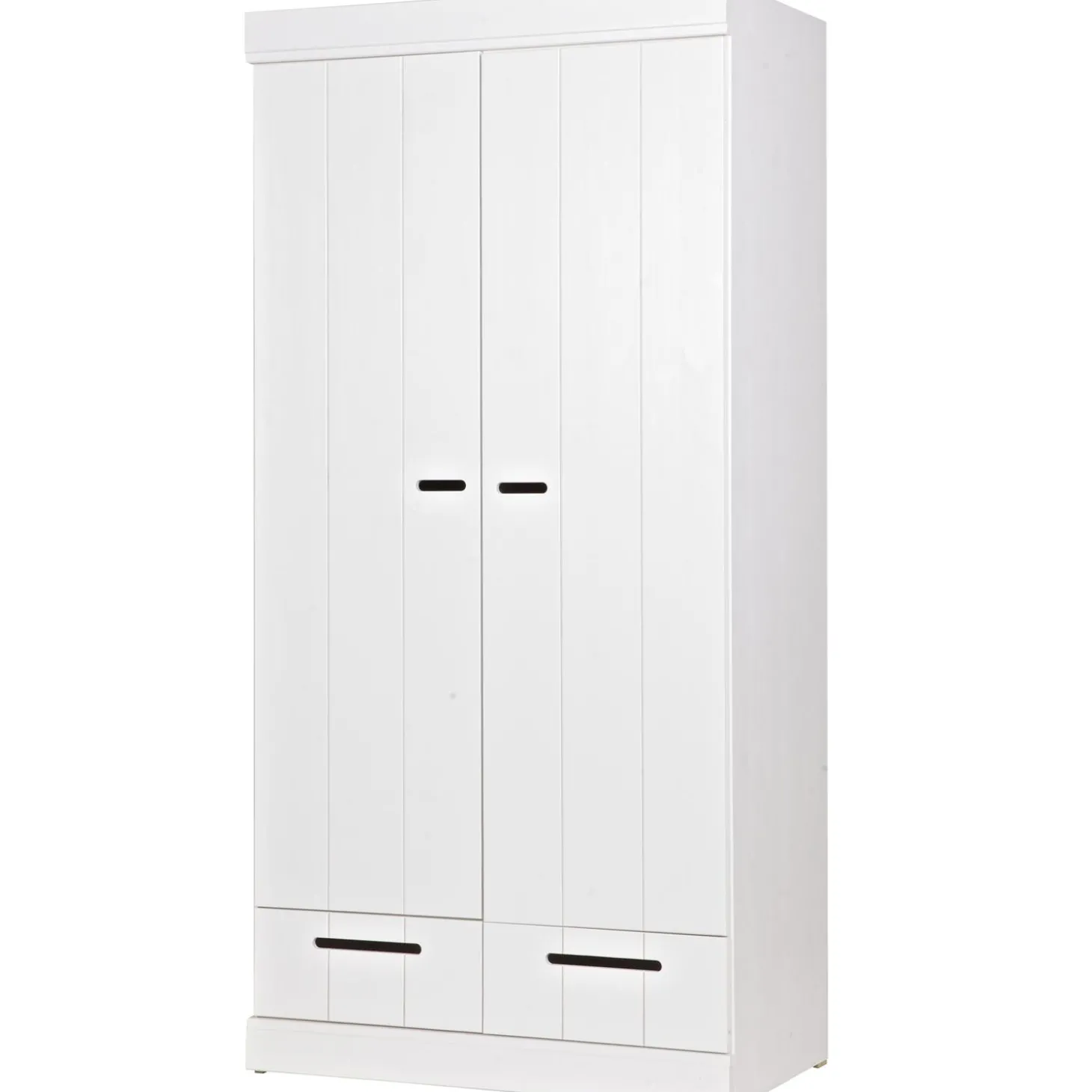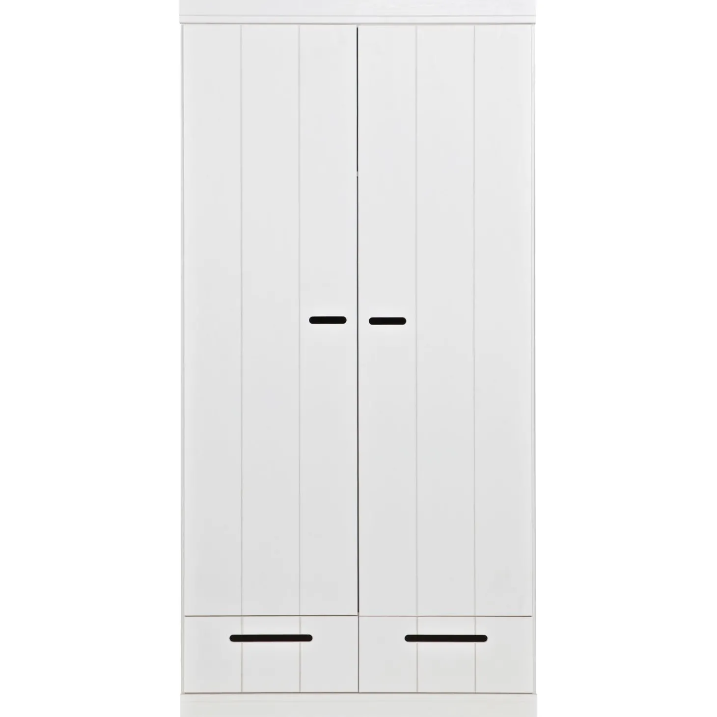 Uit de serie CONNECT; een stoere basic 2-deurs kledingkast met strakke sokkel en koof gecombineerd met strokendeuren met sleufgrepen en 2 ladesvoorzien van solidemetalen ladegeleiders.Met de CONNECT kasten kun je je eigen kastenwand bouwen! De romp van de CONNECT kledingkast is gemaakt van massief grenenhout dat afkomstig is van een FSC gecertificeerde leverancier. De binnenzijde is voorzien van gemĆŖlamineerde legplanken, praktisch met schoonmaken! De kasten zijn in de kleur wit gespoten, maar je schildert ze zelf binnen een handomdraai ook in een andere kleur (gebruik in dat geval watergedragen lak).