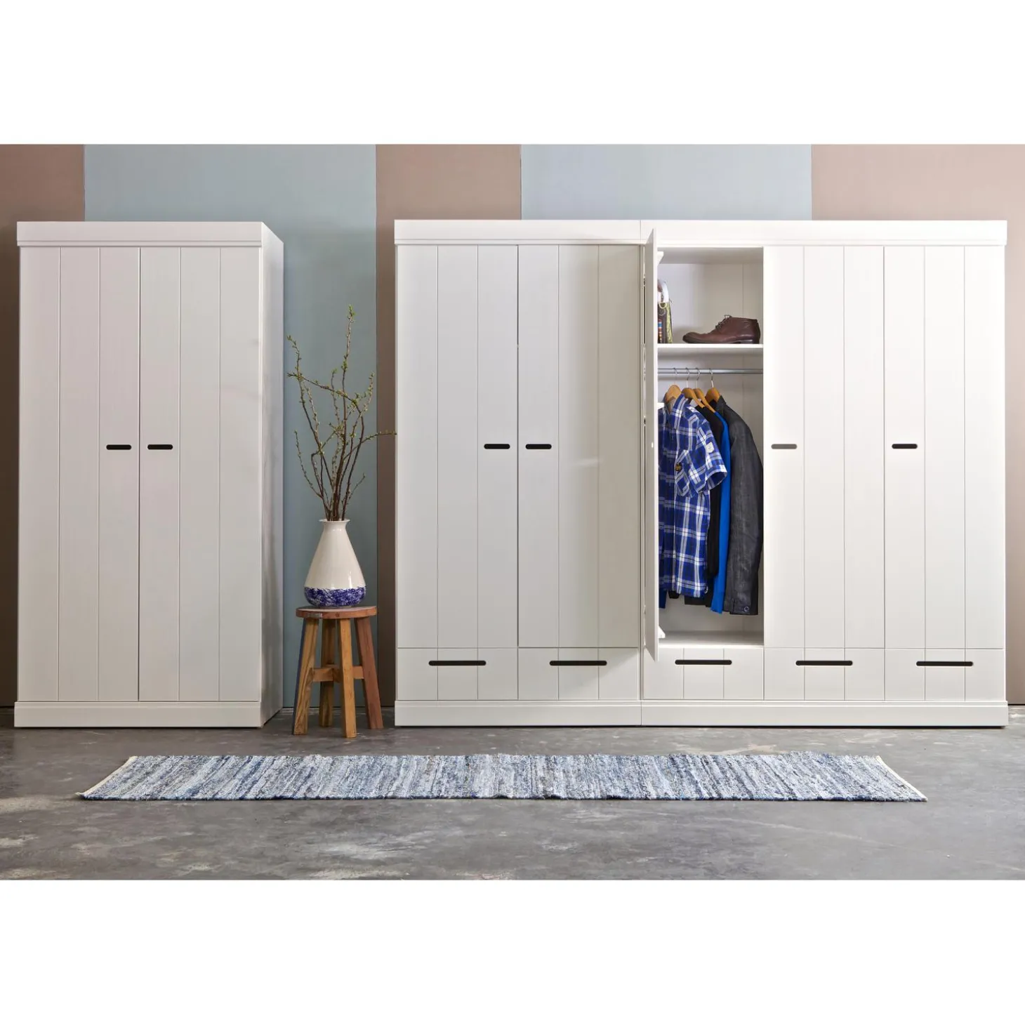 De serie CONNECT bestaat uit een ladekast en 3 basiskasten: Een 2-deurs kast, een 2-deurs kast met lades en een 3-deurs kast met lades. De kasten zijn zo gemaakt dat ze vlak tegen elkaar aan kunnen worden geplaatst en zo kun je de kastwand zo breed maken als je zelf wilt. Wij adviseren de ladenkast tussen twee kasten te plaatsen, deze kast is namelijk minder diep.