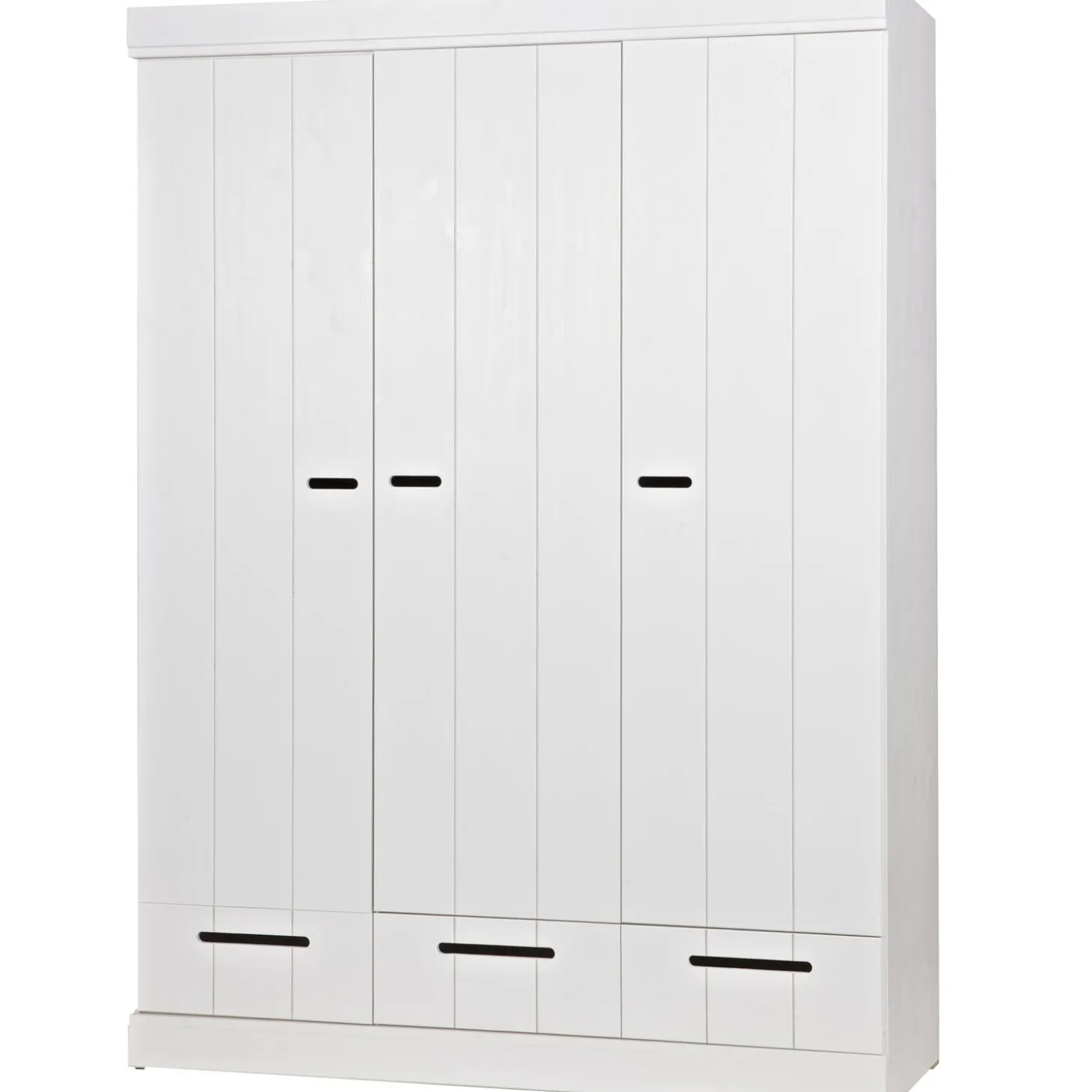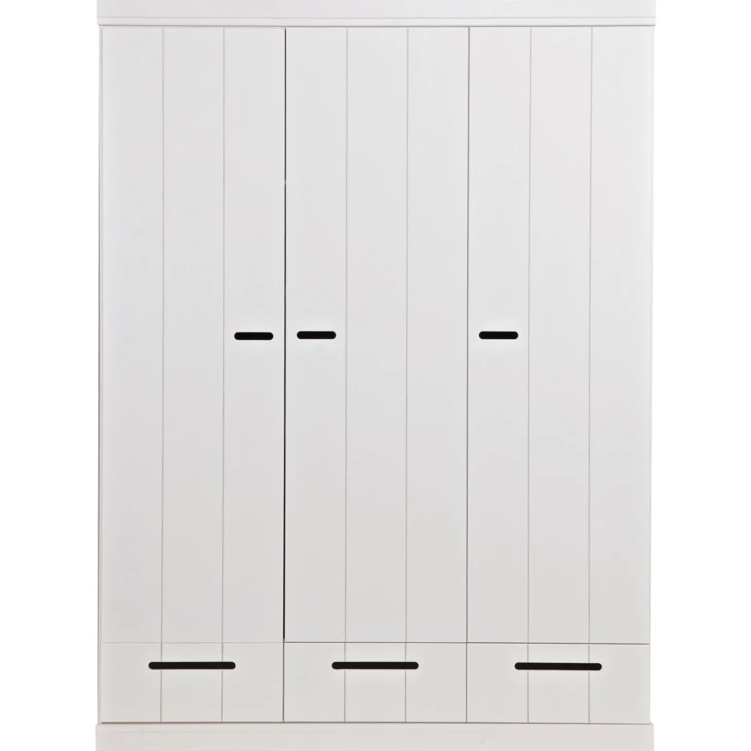 Uit de serie CONNECT; een stoere basic 3-deurs kledingkast met strakke sokkel en koof gecombineerd strokendeuren met sleufgrepen en3 lades voorzien van solidemetalen ladegeleiders.