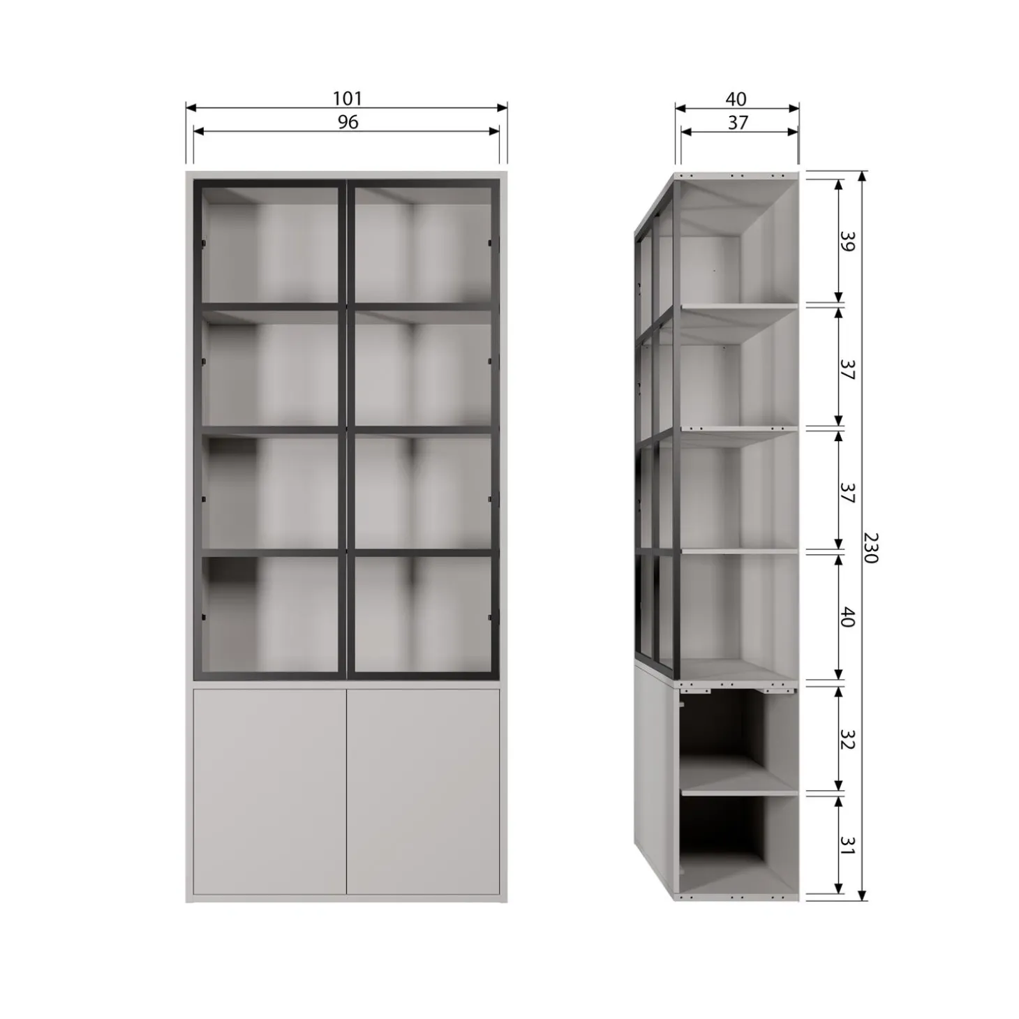 De kast Basic biedt heel veel opbergruimte. Ieder vakheeft zijn eigen afmetingen. De afmetingen van de vakken achter de bovenste deur zijn van boven naar beneden H x B x D: 39,5 x 101x 36 cm, 37 x 96x 36 cm, 37,5 x 101x 36 cm, 39 x 101x 36 cm. De afmetingen van de vakken achter de onderste deur zijn van boven naar beneden H x B x D: 30 x 101x 36,5 cm en 31,5 x 101x 36,5 cm.