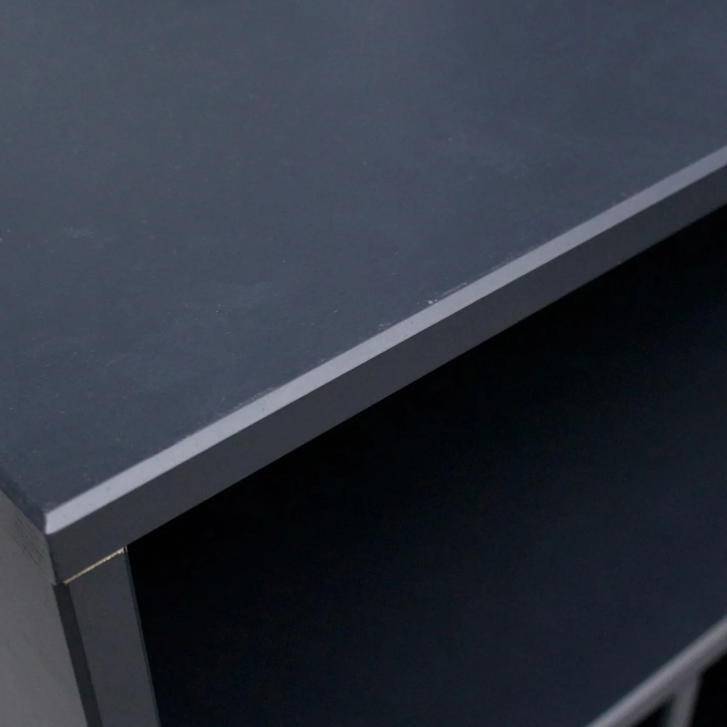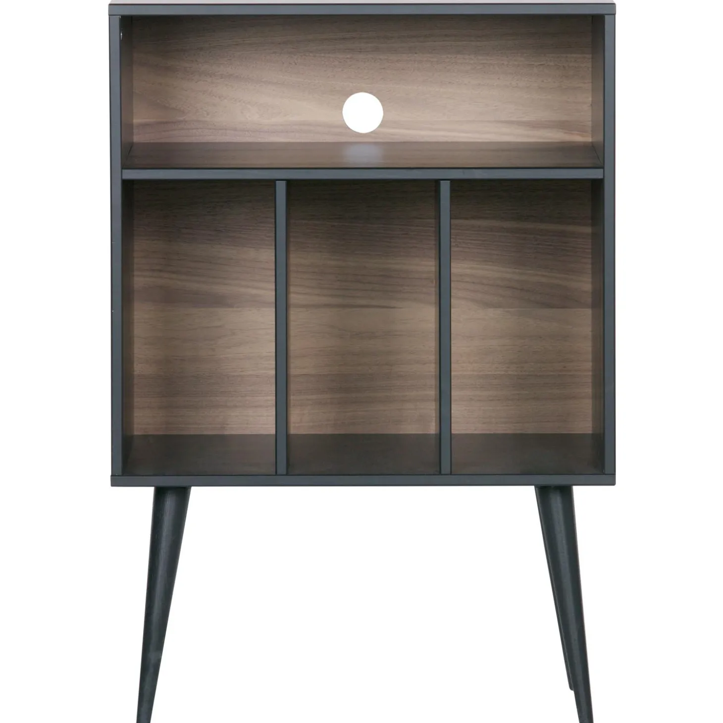 Uit de James serie van het merk WOOOD is dit bijzonder fraaie kastje. Kastje James is uitgevoerd in mat zwart gelakt grenen in combinatie met een MDF notenprint achterzijde. Het noten fineer is afgewerkt met een matte lak. Het kastje is speciaal ontwikkeld om in de 3 vakken aan de onderzijde LP’s te plaatsen ( H 35 x B 18 cm). Het brede vak bovenin is ontworpen om de versterker in te plaatsen, daar is namelijk een gat in de achterzijde van het kastje gemaakt om je snoeren doorheen te halen. Je kunt het kastje natuurlijk ook gebruiken voor andere functies! Denk bijvoorbeeld aan een handig kastje in de hal, of een prachtig kastje voor naast je bed..