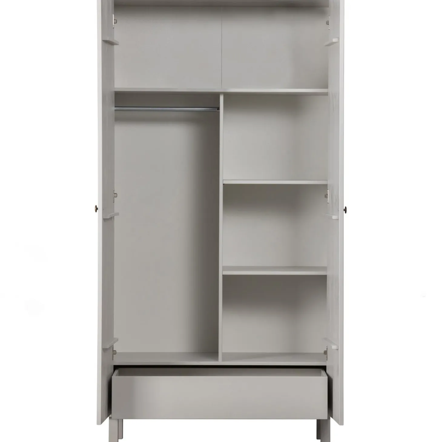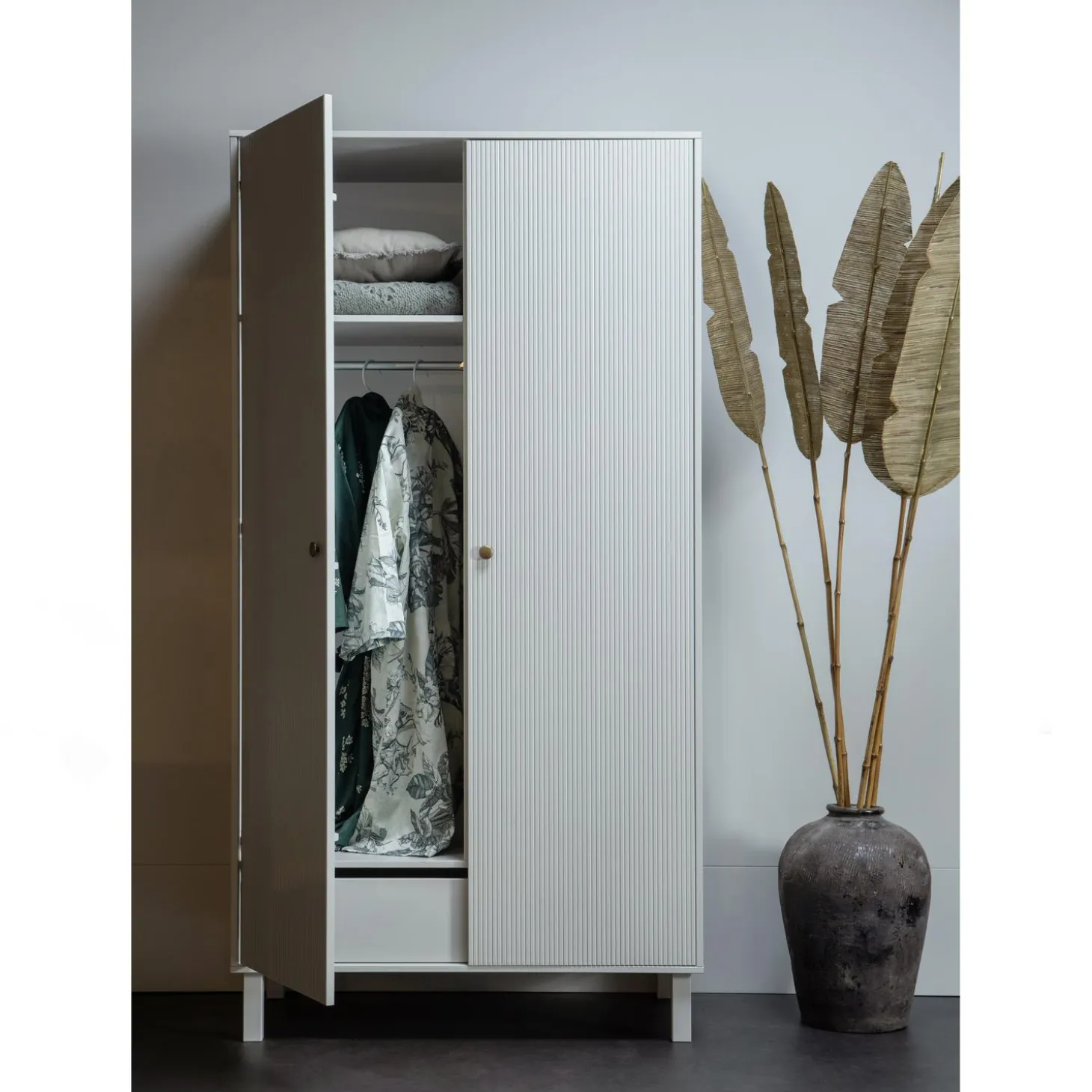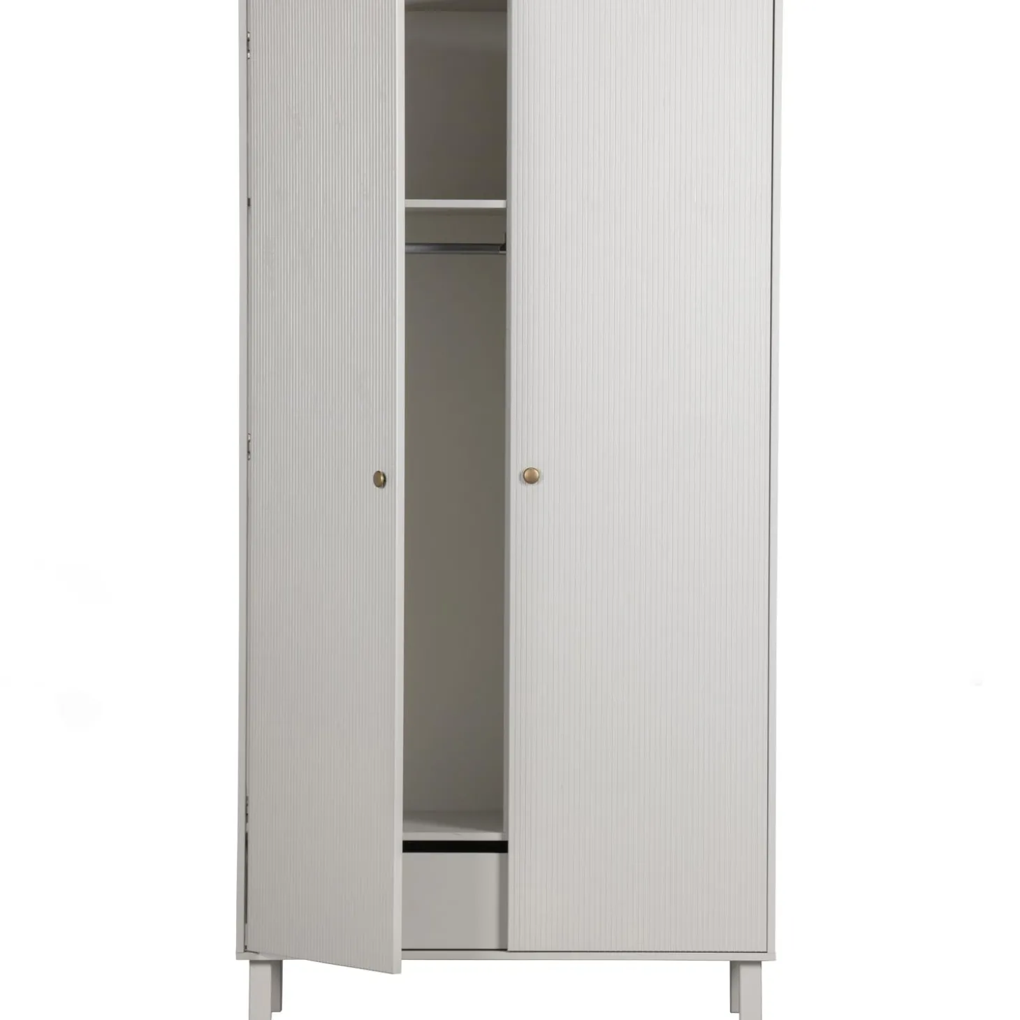 Madu is voorzien van twee deuren met goudkleurige knopjes. Achter deze deuren bevinden zich 4 legplanken, een hanggedeelte en een royale lade. De ruimtes hebben een breedte van 190 cm en een diepte van 50 cm. Het hanggedeelte en halve legplanken zijn 79 cm breed.