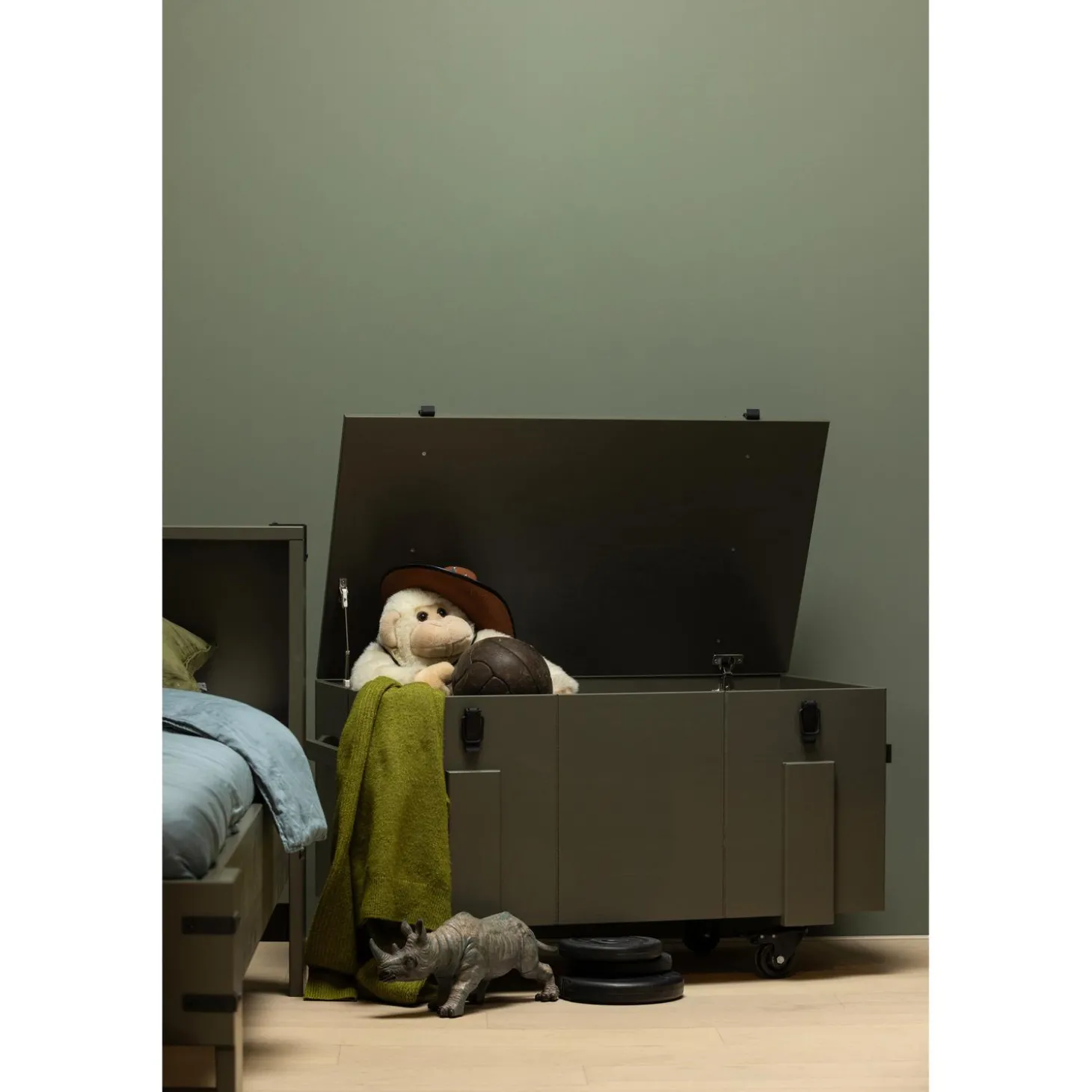 Ben jij op zoek naar stoere meubels voor de kinderkamer? Maak dan kennis met de meubelserie Bobby van het Nederlandse interieurmerk WOOOD. Deze stoere opbergkist is een onderdeel van deze kinderkamer serie. Hettijdloze, eenvoudige design wordt versterkt door de veelzijdige groentint. De kist is gemaakt van massief grenenhout en heeft duidelijk zichtbare nerven. Daardoor heeft Bobby een warme en levendige uitstraling. De opbergkist is voorzien van grote klep en brengt een zee aan opbergruimte voor heel veel losse spulletjes. De Bobby opbergkist is kenmerkend door de stoere kleur en zwart metalen details.