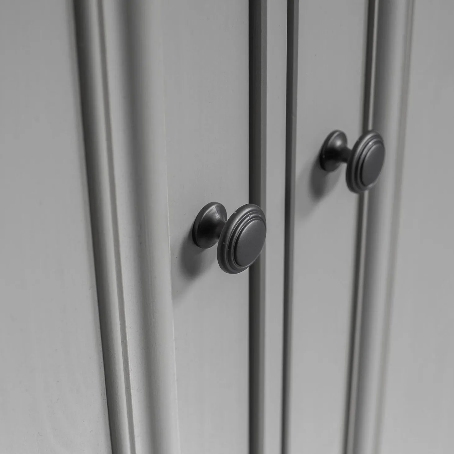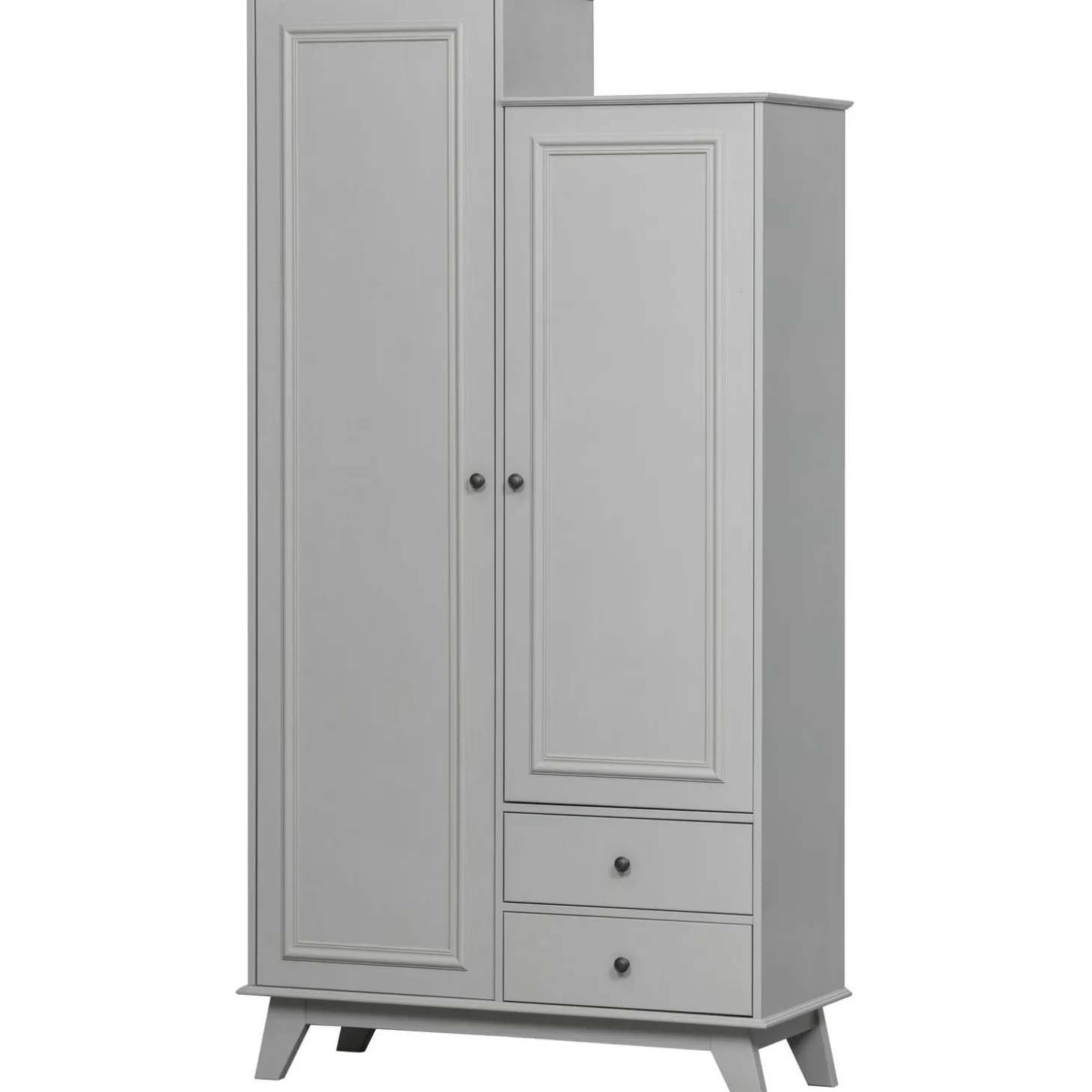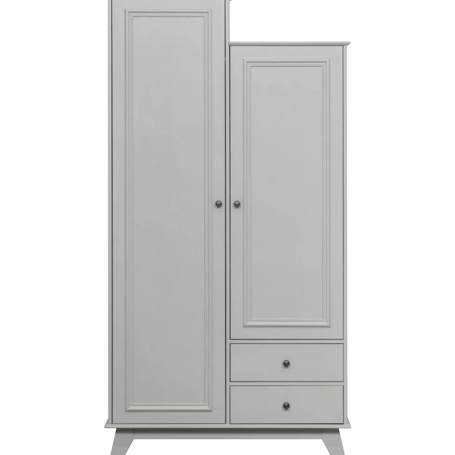Wat een plaatje! Deze romantische, speelse garderobekast Lily is een eigen ontwerp uit de WOOOD collectie. Deze garderobekast brengt direct een gezellige sfeer in je interieur. De kast is gemaakt van warmgrijs, gelakt grenenhout dat afkomstig is van een FSC gecertificeerde leverancier. Het interieur van deze kast is gemaakt van gemelamineerd spaanplaat. De linkerzijde van de kast is voorzien van een hanggedeelte (112cm), waarbij zich daarboven (25 cm) en onder (32 cm) ruimte bevindt om spullen op te bergen. De rechterkant van de kast is ingericht met 3 brede legplanken (45cm) met een diepte van 38cm. De twee lades die zich onder de rechterdeur bevinden zijn voorzien van ladegeleiders, hebben een diepte van 32 cam en een breedte van 41 cm. Genoeg ruimte om spullen in op te bergen die je liever niet hebt rondslingeren in de kinderkamer.